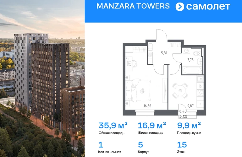 Строим кварталы для жизни с заботой о будущем. Предлагается 1-комнатная квартира комфорт-класса 35,94 кв.м в корпусе 5 на 15 этаже, в MANZARA TOWERS Квартира с черновой отделкой. Доступность опции «отделка» и возможность комплектации мебелью и декором уточняйте у застройщика. Приобрести квартиру возможно по специальным акциям от застройщика, с текущими условиями акций можно ознакомиться в блоке «Акций». Цена динамическая и может отличаться, уточняйте актуальность у застройщика. Manzara Towers — это дома высотой от 7 до 24 этажей. В увеличенных окнах с зеркальной поверхностью отражаются облака и солнечные блики. Тихий двор с игровыми площадками и воркаут-пространством идеален для прогулок с кофе. На первом этаже есть выход на стилобат, где появятся зеленые оазисы и открытые террасы. Дома соединяет между собой частично прозрачный пешеходный мост. Предусмотрены подземный и 6-этажный многоуровневый паркинги. До ж/д вокзалов можно доехать за 20 минут. Или в обеденный перерыв встретиться с друзьями в центре города — дорога на машине займет около 15 минут. На первых этажах корпусов откроется детская поликлиника, ФОК с бассейном, магазины, кафе и салоны красоты. Для маленьких жителей уже работают 3 детских сада и лицей, до которых можно дойти за 6–15 минут. Во всех наших корпусах входы в светлые лобби находятся на уровне земли. На первом этаже есть специальные места для хранения колясок и велосипедов. #yan19-2r1814436#О застройщике