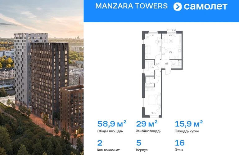 Строим кварталы для жизни с заботой о будущем. Предлагается 2-комнатная квартира комфорт-класса 58,92 кв.м в корпусе 5 на 16 этаже, в MANZARA TOWERS Квартира с предчистовой отделкой. Доступность дополнительных опций уточняйте у застройщика. Приобрести квартиру возможно по специальным акциям от застройщика, с текущими условиями акций можно ознакомиться в блоке «Акций». Цена динамическая и может отличаться, уточняйте актуальность у застройщика. Manzara Towers — это дома высотой от 7 до 24 этажей. В увеличенных окнах с зеркальной поверхностью отражаются облака и солнечные блики. Тихий двор с игровыми площадками и воркаут-пространством идеален для прогулок с кофе. На первом этаже есть выход на стилобат, где появятся зеленые оазисы и открытые террасы. Дома соединяет между собой частично прозрачный пешеходный мост. Предусмотрены подземный и 6-этажный многоуровневый паркинги. До ж/д вокзалов можно доехать за 20 минут. Или в обеденный перерыв встретиться с друзьями в центре города — дорога на машине займет около 15 минут. На первых этажах корпусов откроется детская поликлиника, ФОК с бассейном, магазины, кафе и салоны красоты. Для маленьких жителей уже работают 3 детских сада и лицей, до которых можно дойти за 6–15 минут. Во всех наших корпусах входы в светлые лобби находятся на уровне земли. На первом этаже есть специальные места для хранения колясок и велосипедов. #yan19-2r1814437#О застройщике