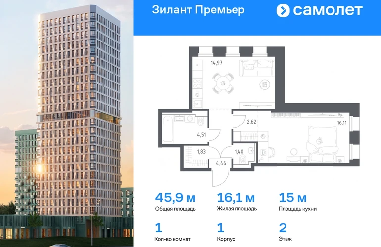 Строим кварталы для жизни с заботой о будущем. Предлагается 1-комнатная квартира комфорт-класса 45,9 кв.м в корпусе 1 на 2 этаже, в ЖК «Зилант Премьер» Квартира с предчистовой отделкой. Доступность дополнительных опций уточняйте у застройщика. Приобрести квартиру возможно по специальным акциям от застройщика, с текущими условиями акций можно ознакомиться в блоке «Акций». Цена динамическая и может отличаться, уточняйте актуальность у застройщика. Жилой комплекс «Зилант Премьер» расположен в молодом районе города. До кремля — 20 минут на авто. В получасе пешком — метро «Горки». Рядом Горкинско-Ометьевский лес, 3 школы, 2 детских сада и поликлиника, скоро откроется свой детский сад. Дома высотой от 1 до 25 этажей с фасадами, которые оживляют открытые французские балконы. В уютном дворе — детские площадки и воркаут-зона.#yan19-2r1769217#О застройщике