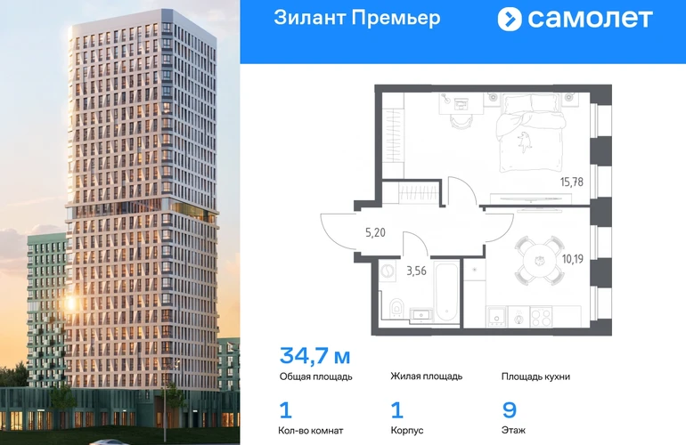 Предлагается 1-комнатная квартира комфорт-класса 34,73 кв.м в корпусе 1 на 9 этаже, в ЖК «Зилант Премьер» Квартира без отделки. Доступность опции "отделка" и возможность комплектации мебелью и декором уточняйте у застройщика. Планировкой предусмотрены: Прихожая - 5,2 м² Кухня - 10,19 м² Общая_комната - 15,78 м² СУ_1 - 3,56 м² Приобрести квартиру возможно по специальным акциям от застройщика, с текущими условиями акций можно ознакомиться в блоке “Акций”. Цена динамическая и может отличаться, уточняйте актуальность у застройщика. Жилой комплекс «Зилант Премьер» расположен в молодом районе города. До кремля — 20 минут на авто. В получасе пешком — метро «Горки». Рядом Горкинско-Ометьевский лес, 3 школы, 2 детских сада и поликлиника, скоро откроется свой детский сад. Дома высотой от 1 до 25 этажей с фасадами, которые оживляют открытые французские балконы. В уютном дворе — детские площадки и воркаут-зона.#yan19-2r1769843#О застройщике
