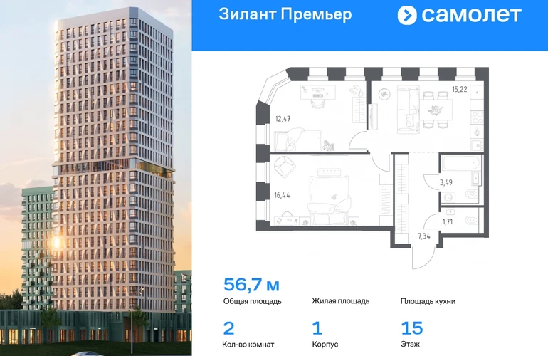 Строим кварталы для жизни с заботой о будущем. Предлагается 2-комнатная квартира комфорт-класса 56,67 кв.м в корпусе 1 на 15 этаже, в ЖК «Зилант Премьер» Квартира с предчистовой отделкой. Доступность дополнительных опций уточняйте у застройщика. Приобрести квартиру возможно по специальным акциям от застройщика, с текущими условиями акций можно ознакомиться в блоке «Акций». Цена динамическая и может отличаться, уточняйте актуальность у застройщика. Жилой комплекс «Зилант Премьер» расположен в молодом районе города. До кремля — 20 минут на авто. В получасе пешком — метро «Горки». Рядом Горкинско-Ометьевский лес, 3 школы, 2 детских сада и поликлиника, скоро откроется свой детский сад. Дома высотой от 1 до 25 этажей с фасадами, которые оживляют открытые французские балконы. В уютном дворе — детские площадки и воркаут-зона.#yan19-2r1770881#О застройщике