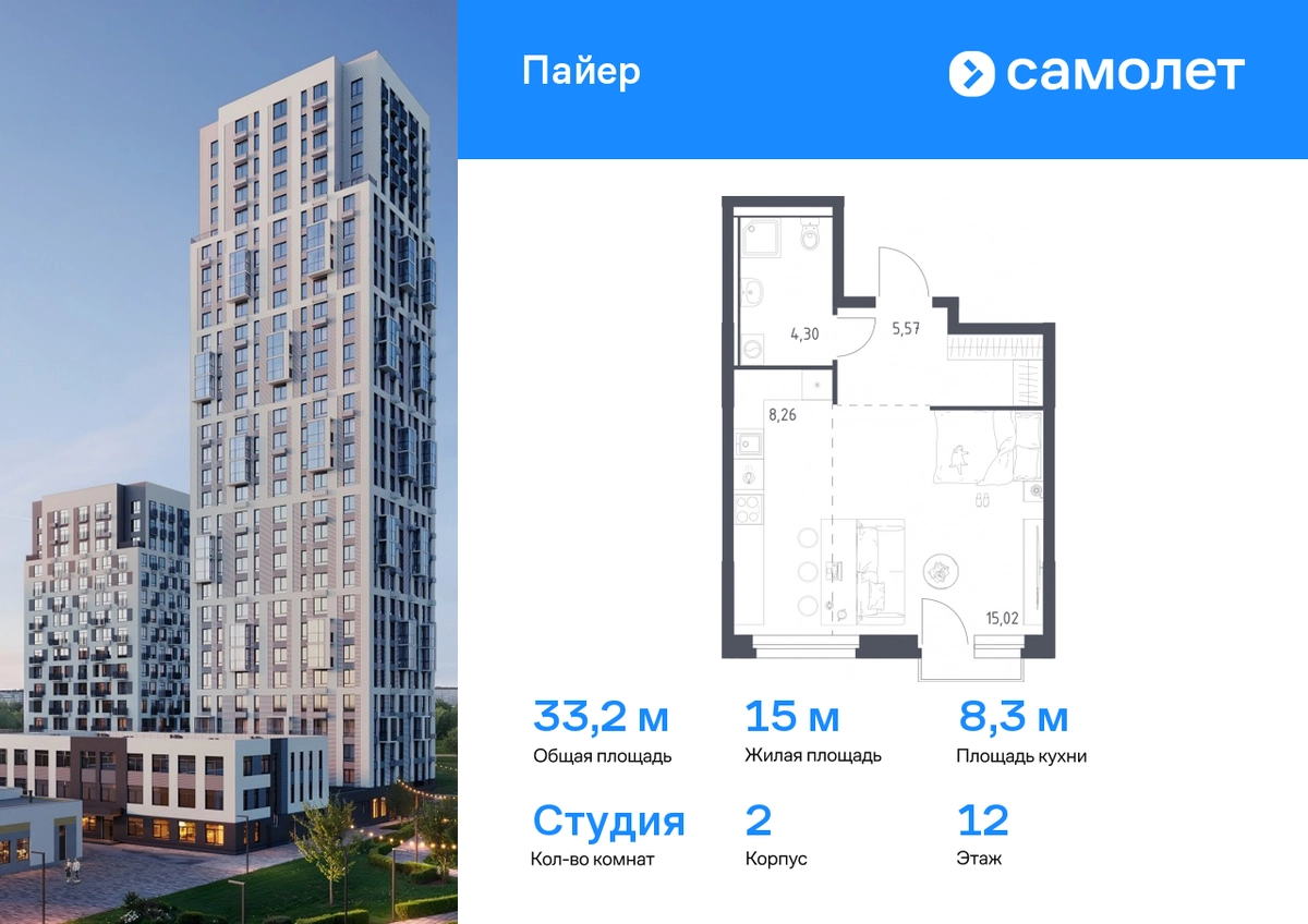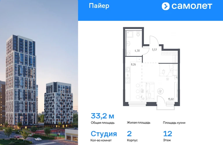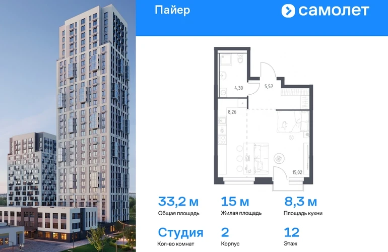 Строим кварталы для жизни с заботой о будущем. Предлагается квартира студия комфорт-класса 33,15 кв.м в корпусе 2 на 12 этаже, в ЖК «Пайер» Квартира с предчистовой отделкой. Доступность дополнительных опций уточняйте у застройщика. Приобрести квартиру возможно по специальным акциям от застройщика, с текущими условиями акций можно ознакомиться в блоке «Акций». Цена динамическая и может отличаться, уточняйте актуальность у застройщика. В жилом квартале «Пайер» мы сохранили уютную и беззаботную атмосферу. До центра Екатеринбурга — 15 минут на авто. Всего 20 минут прогулки - до большого парка на берегу реки Исеть и Ольховского пруда. Рядом работают детские сады, школа, магазины, пункты выдачи, аптеки и кафе. В приватном зеленом дворе-парке есть спортивная и игровая зона. Лаконичные фасады с открытыми террасами выглядят выразительно. Квартиры с предчистовой отделкой.#yan19-2r1770114#О застройщике