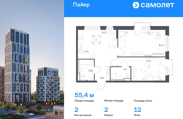 Предлагается 2-комнатная квартира комфорт-класса 55,38 кв.м в корпусе 2 на 12 этаже, в ЖК «Пайер» Квартира без отделки. Доступность опции "отделка" и возможность комплектации мебелью и декором уточняйте у застройщика. Планировкой предусмотрены: Прихожая - 2,84 м² Кухня-ниша - 6,34 м² Кухня-столовая - 10,72 м² Жилая_комната_1 - 16,47 м² Жилая_комната_2 - 11,92 м² СУ_1 - 3,11 м² СУ_2 - 3,98 м² Приобрести квартиру возможно по специальным акциям от застройщика, с текущими условиями акций можно ознакомиться в блоке “Акций”. Цена динамическая и может отличаться, уточняйте актуальность у застройщика. В жилом квартале «Пайер» мы сохранили уютную и беззаботную атмосферу. До центра Екатеринбурга — 15 минут на авто. Всего 20 минут прогулки - до большого парка на берегу реки Исеть и Ольховского пруда. Рядом работают детские сады, школа, магазины, пункты выдачи, аптеки и кафе. В приватном зеленом дворе-парке есть спортивная и игровая зона. Лаконичные фасады с открытыми террасами выглядят выразительно. Квартиры с предчистовой отделкой.#yan19-2r1770115#О застройщике