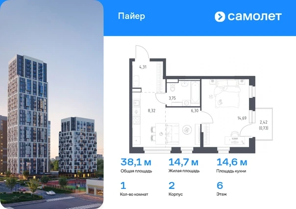 Предлагается 1-комнатная квартира комфорт-класса 38,1 кв.м в корпусе 2 на 6 этаже, в ЖК «Пайер» Квартира без отделки. Доступность опции "отделка" и возможность комплектации мебелью и декором уточняйте у застройщика. Планировкой предусмотрены: Прихожая - 4,31 м² Кухня-ниша - 8,32 м² Кухня-столовая - 6,3 м² Жилая_комната_1 - 14,69 м² СУ_1 - 3,75 м² Балкон_1 - 0,73 м² Приобрести квартиру возможно по специальным акциям от застройщика, с текущими условиями акций можно ознакомиться в блоке “Акций”. Цена динамическая и может отличаться, уточняйте актуальность у застройщика. В жилом квартале «Пайер» мы сохранили уютную и беззаботную атмосферу. До центра Екатеринбурга — 15 минут на авто. Всего 20 минут прогулки - до большого парка на берегу реки Исеть и Ольховского пруда. Рядом работают детские сады, школа, магазины, пункты выдачи, аптеки и кафе. В приватном зеленом дворе-парке есть спортивная и игровая зона. Лаконичные фасады с открытыми террасами выглядят выразительно. Квартиры с предчистовой отделкой.#yan19-2r1772462#О застройщике