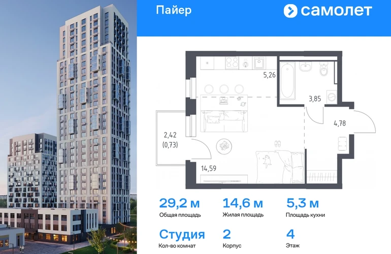 Строим кварталы для жизни с заботой о будущем. Предлагается квартира студия комфорт-класса 29,21 кв.м в корпусе 2 на 4 этаже, в ЖК «Пайер» Квартира с предчистовой отделкой. Доступность дополнительных опций уточняйте у застройщика. Приобрести квартиру возможно по специальным акциям от застройщика, с текущими условиями акций можно ознакомиться в блоке «Акций». Цена динамическая и может отличаться, уточняйте актуальность у застройщика. В жилом квартале «Пайер» мы сохранили уютную и беззаботную атмосферу. До центра Екатеринбурга — 15 минут на авто. Всего 20 минут прогулки - до большого парка на берегу реки Исеть и Ольховского пруда. Рядом работают детские сады, школа, магазины, пункты выдачи, аптеки и кафе. В приватном зеленом дворе-парке есть спортивная и игровая зона. Лаконичные фасады с открытыми террасами выглядят выразительно. Квартиры с предчистовой отделкой.#yan19-2r1778779#О застройщике