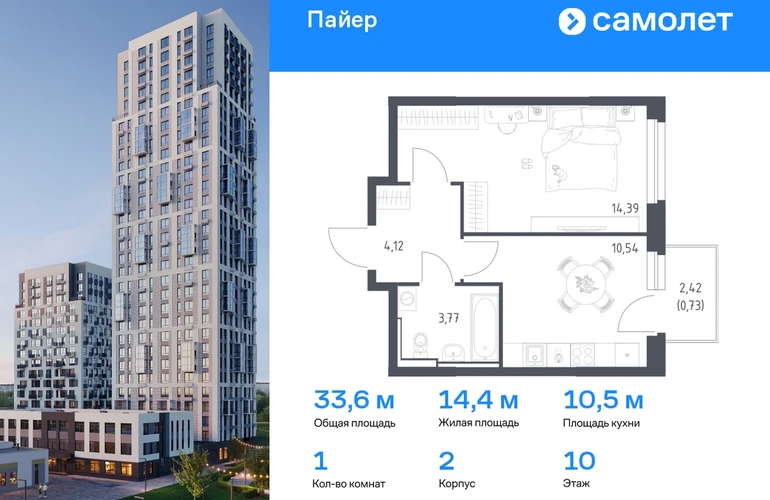 Предлагается 1-комнатная квартира комфорт-класса 33,55 кв.м в корпусе 2 на 10 этаже, в ЖК «Пайер» Квартира с предчистовой отделкой. Доступность дополнительных опций уточняйте у застройщика. Приобрести квартиру возможно по специальным акциям от застройщика, с текущими условиями акций можно ознакомиться в блоке «Акций». Цена динамическая и может отличаться, уточняйте актуальность у застройщика. В жилом квартале «Пайер» мы сохранили уютную и беззаботную атмосферу. До центра Екатеринбурга — 15 минут на авто. Всего 20 минут прогулки - до большого парка на берегу реки Исеть и Ольховского пруда. Рядом работают детские сады, школа, магазины, пункты выдачи, аптеки и кафе. В приватном зеленом дворе-парке есть спортивная и игровая зона. Лаконичные фасады с открытыми террасами выглядят выразительно. Квартиры с предчистовой отделкой.#yan19-2r1779337#О застройщике