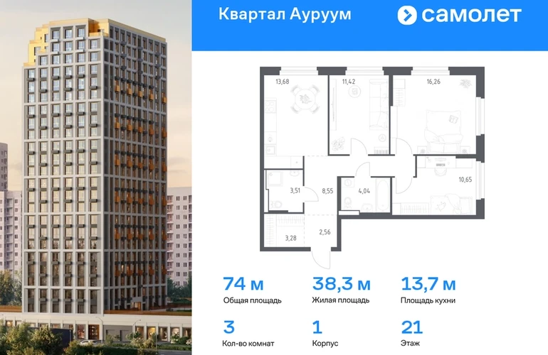 Предлагается 3-комнатная квартира бизнес-класса 73,95 кв.м в корпусе 1 на 21 этаже, в ЖК «Квартал Ауруум» Квартира с предчистовой отделкой. Доступность дополнительных опций уточняйте у застройщика. Приобрести квартиру возможно по специальным акциям от застройщика, с текущими условиями акций можно ознакомиться в блоке “Акций”. Цена динамическая и может отличаться, уточняйте актуальность у застройщика. «Квартал Ауруум» — это море зелени под вашими окнами и жизнь в уютном квартале с собственной инфраструктурой. До центра города — всего 15 минут на авто. Жилой квартал находится в развитом районе, где все необходимое рядом — свой детский сад, магазины, кафе и школа — через дорогу. 4 разновысотных корпуса, от 14 до 31 этажа, дарят ощущение простора и много естественного света в квартирах. Для неспешных прогулок - приватный двор-сад или Основинский парк у подножия комплекса. Для авто — подземный паркинг. Все квартиры с предчистовой отделкой.#yan19-2r1741240#О застройщике
