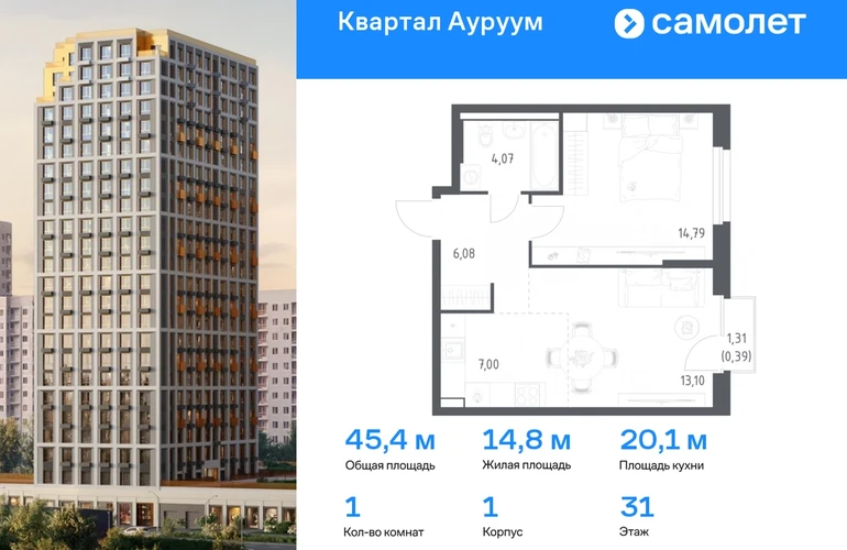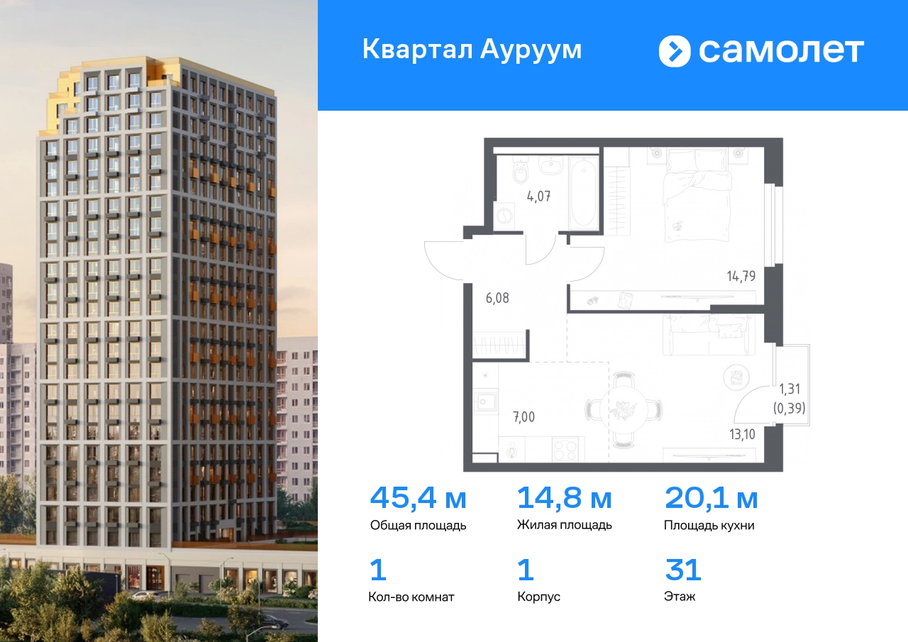 Предлагается 1-комнатная квартира бизнес-класса 45,43 кв.м в корпусе 1 на 31 этаже, в ЖК «Квартал Ауруум» Квартира с предчистовой отделкой. Доступность дополнительных опций уточняйте у застройщика. Приобрести квартиру возможно по специальным акциям от застройщика, с текущими условиями акций можно ознакомиться в блоке “Акций”. Цена динамическая и может отличаться, уточняйте актуальность у застройщика. «Квартал Ауруум» — это море зелени под вашими окнами и жизнь в уютном квартале с собственной инфраструктурой. До центра города — всего 15 минут на авто. Жилой квартал находится в развитом районе, где все необходимое рядом — свой детский сад, магазины, кафе и школа — через дорогу. 4 разновысотных корпуса, от 14 до 31 этажа, дарят ощущение простора и много естественного света в квартирах. Для неспешных прогулок - приватный двор-сад или Основинский парк у подножия комплекса. Для авто — подземный паркинг. Все квартиры с предчистовой отделкой.#yan19-2r1741266#О застройщике