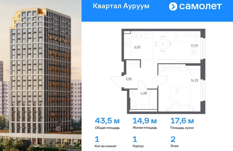 Предлагается 1-комнатная квартира бизнес-класса 43,45 кв.м в корпусе 1 на 2 этаже, в ЖК «Квартал Ауруум» Квартира с предчистовой отделкой. Доступность дополнительных опций уточняйте у застройщика. Приобрести квартиру возможно по специальным акциям от застройщика, с текущими условиями акций можно ознакомиться в блоке “Акций”. Цена динамическая и может отличаться, уточняйте актуальность у застройщика. «Квартал Ауруум» — это море зелени под вашими окнами и жизнь в уютном квартале с собственной инфраструктурой. До центра города — всего 15 минут на авто. Жилой квартал находится в развитом районе, где все необходимое рядом — свой детский сад, магазины, кафе и школа — через дорогу. 4 разновысотных корпуса, от 14 до 31 этажа, дарят ощущение простора и много естественного света в квартирах. Для неспешных прогулок - приватный двор-сад или Основинский парк у подножия комплекса. Для авто — подземный паркинг. Все квартиры с предчистовой отделкой.#yan19-2r1744832#О застройщике