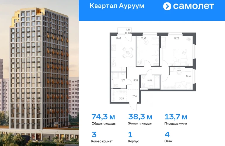 Строим кварталы для жизни с заботой о будущем. Предлагается 3-комнатная квартира бизнес-класса 71,9 кв.м в корпусе 1 на 4 этаже, в ЖК «Квартал Ауруум» Квартира с предчистовой отделкой. Доступность дополнительных опций уточняйте у застройщика. Приобрести квартиру возможно по специальным акциям от застройщика, с текущими условиями акций можно ознакомиться в блоке «Акций». Цена динамическая и может отличаться, уточняйте актуальность у застройщика. «Квартал Ауруум» — это море зелени под вашими окнами и жизнь в уютном квартале с собственной инфраструктурой. До центра города — всего 15 минут на авто. Жилой квартал находится в развитом районе, где все необходимое рядом — свой детский сад, магазины, кафе и школа — через дорогу. 4 разновысотных корпуса, от 14 до 31 этажа, дарят ощущение простора и много естественного света в квартирах. Для неспешных прогулок - приватный двор-сад или Основинский парк у подножия комплекса. Для авто — подземный паркинг. Все квартиры с предчистовой отделкой.#yan19-2r1744834#О застройщике