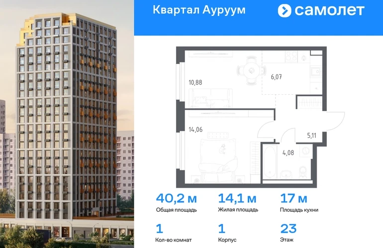 Предлагается 1-комнатная квартира бизнес-класса 40,2 кв.м в корпусе 1 на 23 этаже, в ЖК «Квартал Ауруум» Квартира с предчистовой отделкой. Доступность дополнительных опций уточняйте у застройщика. Приобрести квартиру возможно по специальным акциям от застройщика, с текущими условиями акций можно ознакомиться в блоке “Акций”. Цена динамическая и может отличаться, уточняйте актуальность у застройщика. «Квартал Ауруум» — это море зелени под вашими окнами и жизнь в уютном квартале с собственной инфраструктурой. До центра города — всего 15 минут на авто. Жилой квартал находится в развитом районе, где все необходимое рядом — свой детский сад, магазины, кафе и школа — через дорогу. 4 разновысотных корпуса, от 14 до 31 этажа, дарят ощущение простора и много естественного света в квартирах. Для неспешных прогулок - приватный двор-сад или Основинский парк у подножия комплекса. Для авто — подземный паркинг. Все квартиры с предчистовой отделкой.#yan19-2r1744867#О застройщике