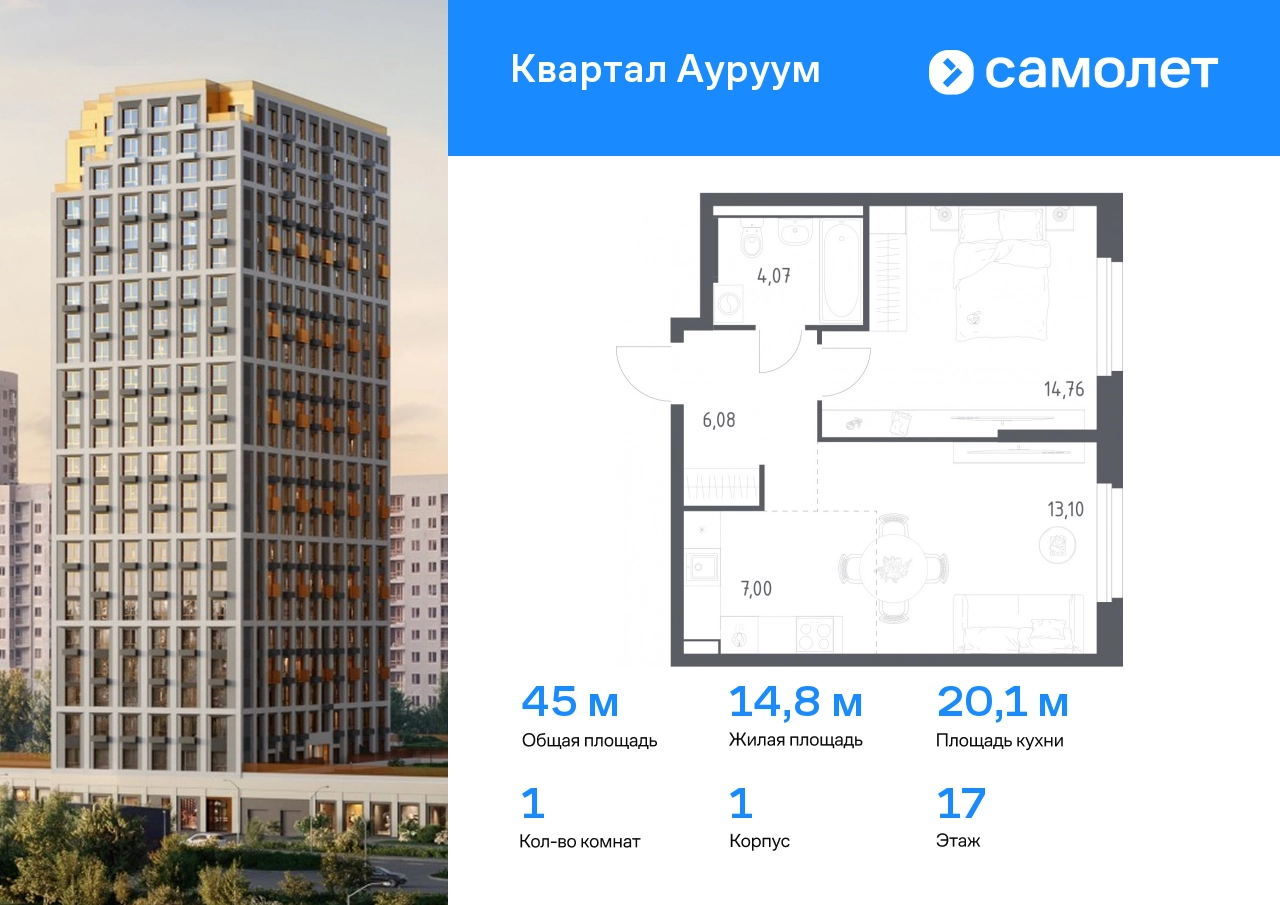 Предлагается 1-комнатная квартира бизнес-класса 45,01 кв.м в корпусе 1 на 17 этаже, в ЖК «Квартал Ауруум» Квартира с предчистовой отделкой. Доступность дополнительных опций уточняйте у застройщика. Приобрести квартиру возможно по специальным акциям от застройщика, с текущими условиями акций можно ознакомиться в блоке “Акций”. Цена динамическая и может отличаться, уточняйте актуальность у застройщика. «Квартал Ауруум» — это море зелени под вашими окнами и жизнь в уютном квартале с собственной инфраструктурой. До центра города — всего 15 минут на авто. Жилой квартал находится в развитом районе, где все необходимое рядом — свой детский сад, магазины, кафе и школа — через дорогу. 4 разновысотных корпуса, от 14 до 31 этажа, дарят ощущение простора и много естественного света в квартирах. Для неспешных прогулок - приватный двор-сад или Основинский парк у подножия комплекса. Для авто — подземный паркинг. Все квартиры с предчистовой отделкой.#yan19-2r1744868#О застройщике