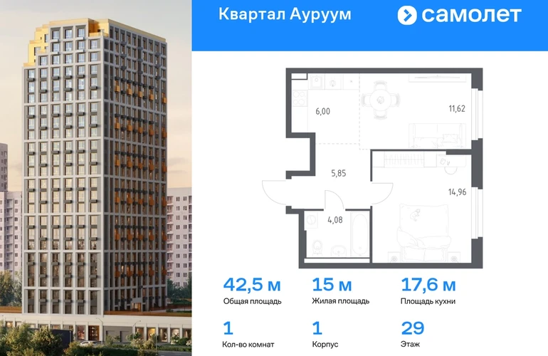 Предлагается 1-комнатная квартира бизнес-класса 42,51 кв.м в корпусе 1 на 29 этаже, в ЖК «Квартал Ауруум» Квартира с предчистовой отделкой. Доступность дополнительных опций уточняйте у застройщика. Приобрести квартиру возможно по специальным акциям от застройщика, с текущими условиями акций можно ознакомиться в блоке “Акций”. Цена динамическая и может отличаться, уточняйте актуальность у застройщика. «Квартал Ауруум» — это море зелени под вашими окнами и жизнь в уютном квартале с собственной инфраструктурой. До центра города — всего 15 минут на авто. Жилой квартал находится в развитом районе, где все необходимое рядом — свой детский сад, магазины, кафе и школа — через дорогу. 4 разновысотных корпуса, от 14 до 31 этажа, дарят ощущение простора и много естественного света в квартирах. Для неспешных прогулок - приватный двор-сад или Основинский парк у подножия комплекса. Для авто — подземный паркинг. Все квартиры с предчистовой отделкой.#yan19-2r1744876#О застройщике