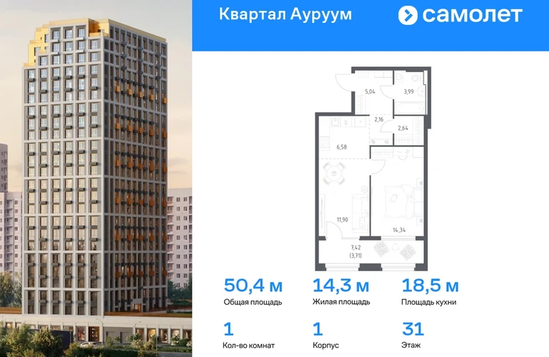 Предлагается 1-комнатная квартира бизнес-класса 50,36 кв.м в корпусе 1 на 31 этаже, в ЖК «Квартал Ауруум» Квартира с предчистовой отделкой. Доступность дополнительных опций уточняйте у застройщика. Приобрести квартиру возможно по специальным акциям от застройщика, с текущими условиями акций можно ознакомиться в блоке “Акций”. Цена динамическая и может отличаться, уточняйте актуальность у застройщика. «Квартал Ауруум» — это море зелени под вашими окнами и жизнь в уютном квартале с собственной инфраструктурой. До центра города — всего 15 минут на авто. Жилой квартал находится в развитом районе, где все необходимое рядом — свой детский сад, магазины, кафе и школа — через дорогу. 4 разновысотных корпуса, от 14 до 31 этажа, дарят ощущение простора и много естественного света в квартирах. Для неспешных прогулок - приватный двор-сад или Основинский парк у подножия комплекса. Для авто — подземный паркинг. Все квартиры с предчистовой отделкой.#yan19-2r1744877#О застройщике