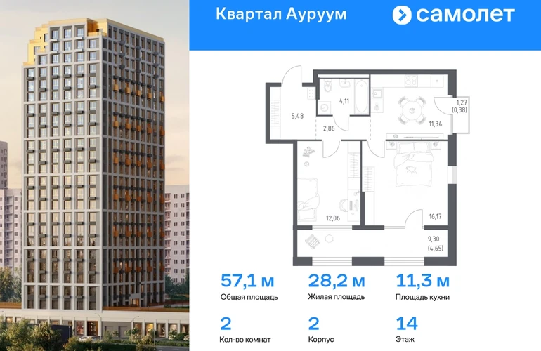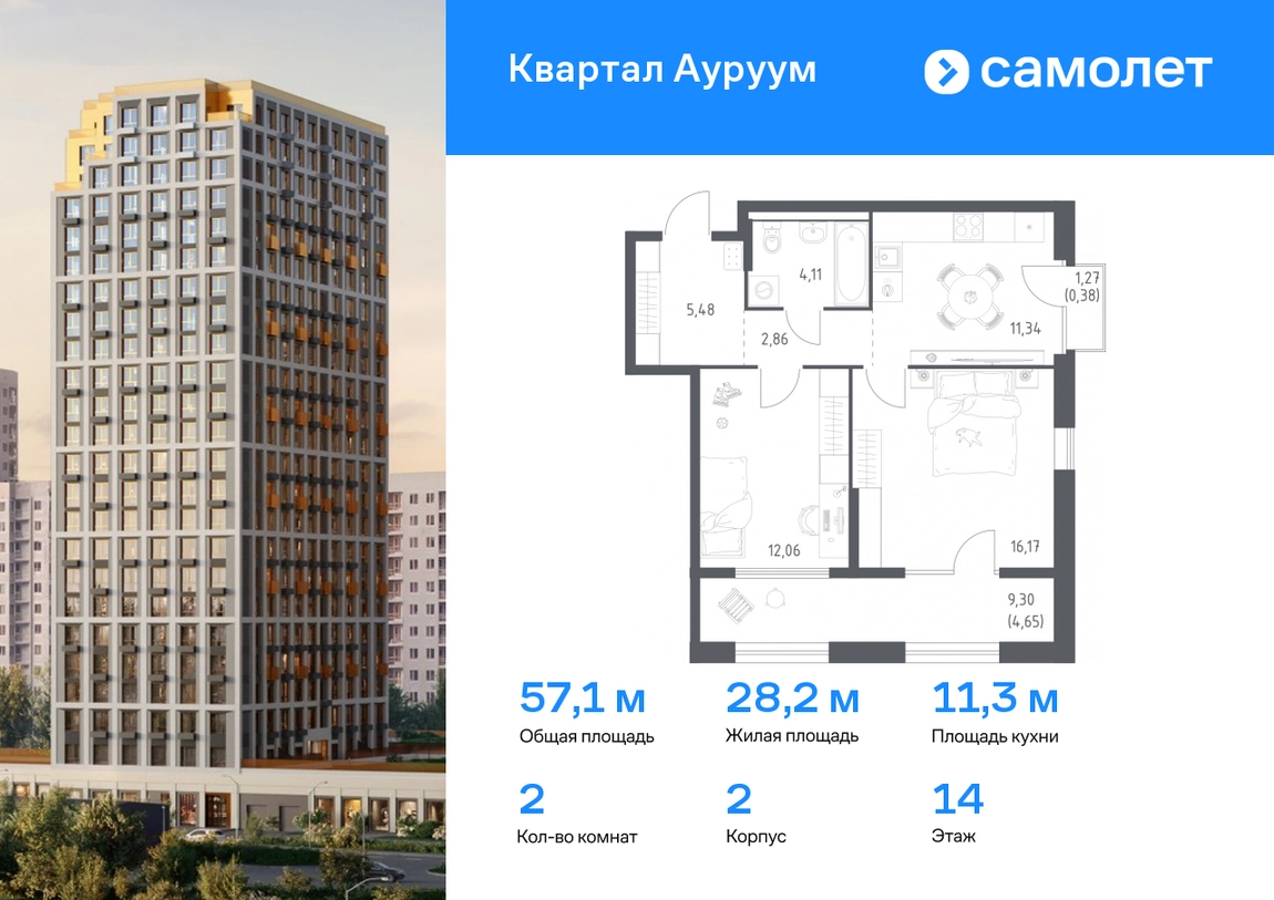 Предлагается 2-комнатная квартира бизнес-класса 57,05 кв.м в корпусе 2 на 14 этаже, в ЖК «Квартал Ауруум» Квартира с предчистовой отделкой. Доступность дополнительных опций уточняйте у застройщика. Приобрести квартиру возможно по специальным акциям от застройщика, с текущими условиями акций можно ознакомиться в блоке “Акций”. Цена динамическая и может отличаться, уточняйте актуальность у застройщика. «Квартал Ауруум» — это море зелени под вашими окнами и жизнь в уютном квартале с собственной инфраструктурой. До центра города — всего 15 минут на авто. Жилой квартал находится в развитом районе, где все необходимое рядом — свой детский сад, магазины, кафе и школа — через дорогу. 4 разновысотных корпуса, от 14 до 31 этажа, дарят ощущение простора и много естественного света в квартирах. Для неспешных прогулок - приватный двор-сад или Основинский парк у подножия комплекса. Для авто — подземный паркинг. Все квартиры с предчистовой отделкой.#yan19-2r1744914#О застройщике
