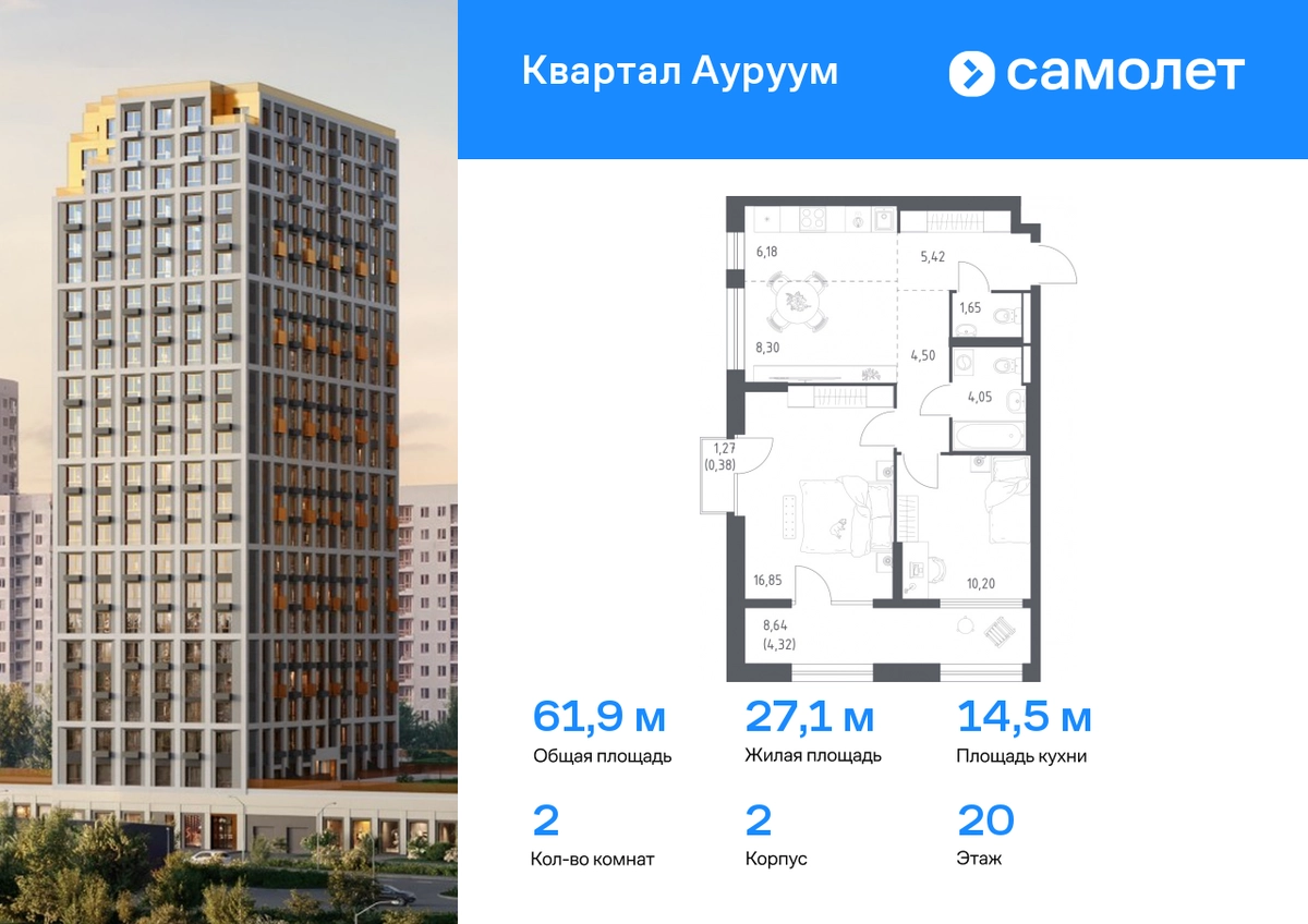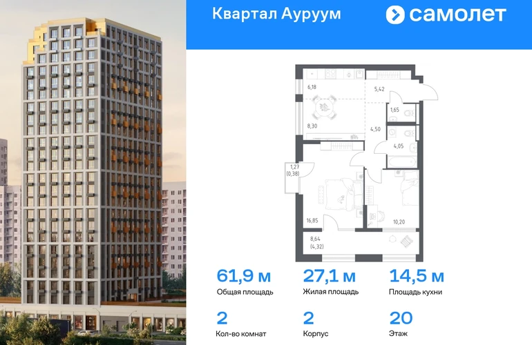 Предлагается 2-комнатная квартира бизнес-класса 61,85 кв.м в корпусе 2 на 20 этаже, в ЖК «Квартал Ауруум» Квартира с предчистовой отделкой. Доступность дополнительных опций уточняйте у застройщика. Приобрести квартиру возможно по специальным акциям от застройщика, с текущими условиями акций можно ознакомиться в блоке “Акций”. Цена динамическая и может отличаться, уточняйте актуальность у застройщика. «Квартал Ауруум» — это море зелени под вашими окнами и жизнь в уютном квартале с собственной инфраструктурой. До центра города — всего 15 минут на авто. Жилой квартал находится в развитом районе, где все необходимое рядом — свой детский сад, магазины, кафе и школа — через дорогу. 4 разновысотных корпуса, от 14 до 31 этажа, дарят ощущение простора и много естественного света в квартирах. Для неспешных прогулок - приватный двор-сад или Основинский парк у подножия комплекса. Для авто — подземный паркинг. Все квартиры с предчистовой отделкой.#yan19-2r1744920#О застройщике