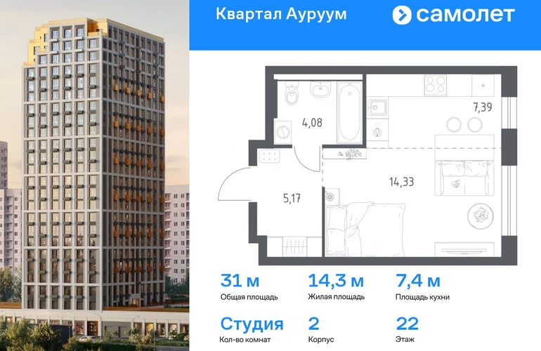 Предлагается квартира студия бизнес-класса 30,97 кв.м в корпусе 2 на 22 этаже, в ЖК «Квартал Ауруум» Квартира с предчистовой отделкой. Доступность дополнительных опций уточняйте у застройщика. Приобрести квартиру возможно по специальным акциям от застройщика, с текущими условиями акций можно ознакомиться в блоке “Акций”. Цена динамическая и может отличаться, уточняйте актуальность у застройщика. «Квартал Ауруум» — это море зелени под вашими окнами и жизнь в уютном квартале с собственной инфраструктурой. До центра города — всего 15 минут на авто. Жилой квартал находится в развитом районе, где все необходимое рядом — свой детский сад, магазины, кафе и школа — через дорогу. 4 разновысотных корпуса, от 14 до 31 этажа, дарят ощущение простора и много естественного света в квартирах. Для неспешных прогулок - приватный двор-сад или Основинский парк у подножия комплекса. Для авто — подземный паркинг. Все квартиры с предчистовой отделкой.#yan19-2r1744925#О застройщике