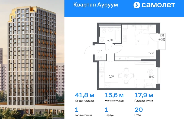 Предлагается 1-комнатная квартира бизнес-класса 41,81 кв.м в корпусе 1 на 20 этаже, в ЖК «Квартал Ауруум» Квартира с предчистовой отделкой. Доступность дополнительных опций уточняйте у застройщика. Приобрести квартиру возможно по специальным акциям от застройщика, с текущими условиями акций можно ознакомиться в блоке “Акций”. Цена динамическая и может отличаться, уточняйте актуальность у застройщика. «Квартал Ауруум» — это море зелени под вашими окнами и жизнь в уютном квартале с собственной инфраструктурой. До центра города — всего 15 минут на авто. Жилой квартал находится в развитом районе, где все необходимое рядом — свой детский сад, магазины, кафе и школа — через дорогу. 4 разновысотных корпуса, от 14 до 31 этажа, дарят ощущение простора и много естественного света в квартирах. Для неспешных прогулок - приватный двор-сад или Основинский парк у подножия комплекса. Для авто — подземный паркинг. Все квартиры с предчистовой отделкой.#yan19-2r1746254#О застройщике