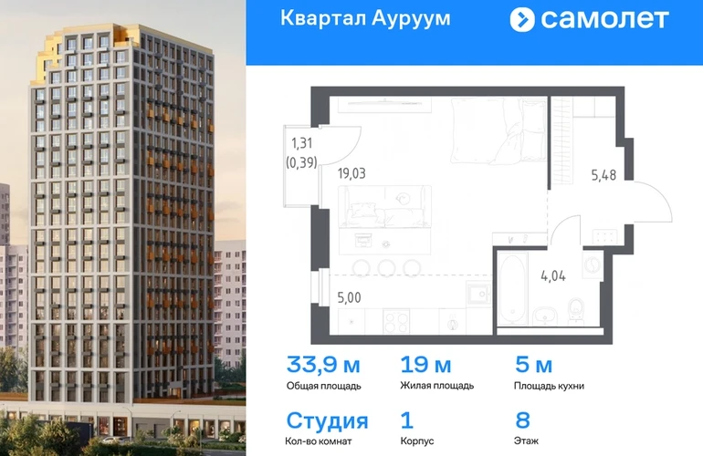 Предлагается квартира студия бизнес-класса 33,94 кв.м в корпусе 1 на 8 этаже, в ЖК «Квартал Ауруум» Квартира с предчистовой отделкой. Доступность дополнительных опций уточняйте у застройщика. Планировкой предусмотрены: Прихожая - 5,48 м² Кухня-ниша - 5,0 м² Студия - 19,03 м² СУ_1 - 4,04 м² Балкон_1 - 0,39 м² Приобрести квартиру возможно по специальным акциям от застройщика, с текущими условиями акций можно ознакомиться в блоке “Акций”. Цена динамическая и может отличаться, уточняйте актуальность у застройщика. «Квартал Ауруум» — это море зелени под вашими окнами и жизнь в уютном квартале с собственной инфраструктурой. До центра города — всего 15 минут на авто. Жилой квартал находится в развитом районе, где все необходимое рядом — свой детский сад, магазины, кафе и школа — через дорогу. 4 разновысотных корпуса, от 14 до 31 этажа, дарят ощущение простора и много естественного света в квартирах. Для неспешных прогулок - приватный двор-сад или Основинский парк у подножия комплекса. Для авто — подземный паркинг. Все квартиры с предчистовой отделкой.#yan19-2r1747510#О застройщике