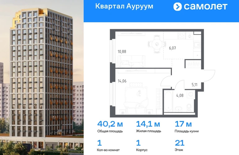 Предлагается 1-комнатная квартира бизнес-класса 40,2 кв.м в корпусе 1 на 21 этаже, в ЖК «Квартал Ауруум» Квартира с предчистовой отделкой. Доступность дополнительных опций уточняйте у застройщика. Приобрести квартиру возможно по специальным акциям от застройщика, с текущими условиями акций можно ознакомиться в блоке “Акций”. Цена динамическая и может отличаться, уточняйте актуальность у застройщика. «Квартал Ауруум» — это море зелени под вашими окнами и жизнь в уютном квартале с собственной инфраструктурой. До центра города — всего 15 минут на авто. Жилой квартал находится в развитом районе, где все необходимое рядом — свой детский сад, магазины, кафе и школа — через дорогу. 4 разновысотных корпуса, от 14 до 31 этажа, дарят ощущение простора и много естественного света в квартирах. Для неспешных прогулок - приватный двор-сад или Основинский парк у подножия комплекса. Для авто — подземный паркинг. Все квартиры с предчистовой отделкой.#yan19-2r1747522#О застройщике