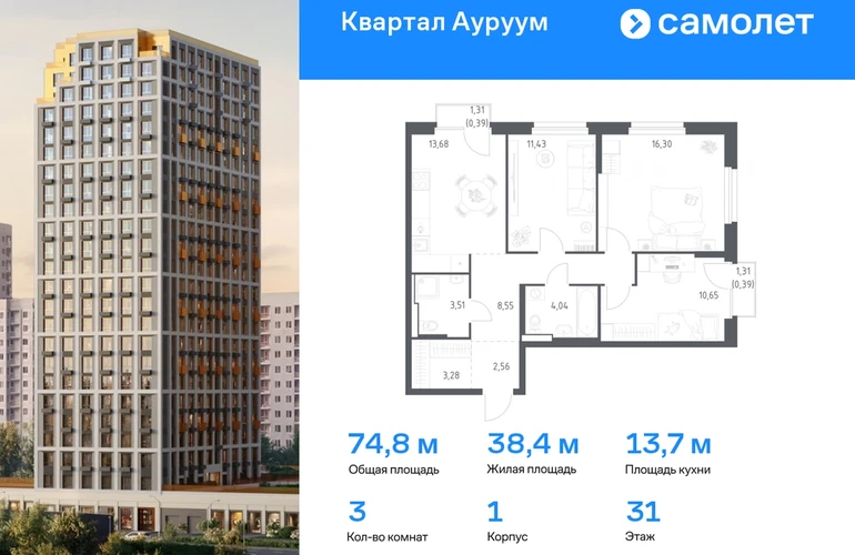Предлагается 3-комнатная квартира бизнес-класса 74,78 кв.м в корпусе 1 на 31 этаже, в ЖК «Квартал Ауруум» Квартира с предчистовой отделкой. Доступность дополнительных опций уточняйте у застройщика. Приобрести квартиру возможно по специальным акциям от застройщика, с текущими условиями акций можно ознакомиться в блоке “Акций”. Цена динамическая и может отличаться, уточняйте актуальность у застройщика. «Квартал Ауруум» — это море зелени под вашими окнами и жизнь в уютном квартале с собственной инфраструктурой. До центра города — всего 15 минут на авто. Жилой квартал находится в развитом районе, где все необходимое рядом — свой детский сад, магазины, кафе и школа — через дорогу. 4 разновысотных корпуса, от 14 до 31 этажа, дарят ощущение простора и много естественного света в квартирах. Для неспешных прогулок - приватный двор-сад или Основинский парк у подножия комплекса. Для авто — подземный паркинг. Все квартиры с предчистовой отделкой.#yan19-2r1750449#О застройщике