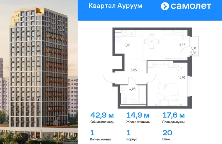 Предлагается 1-комнатная квартира бизнес-класса 42,86 кв.м в корпусе 1 на 20 этаже, в ЖК «Квартал Ауруум» Квартира с предчистовой отделкой. Доступность дополнительных опций уточняйте у застройщика. Приобрести квартиру возможно по специальным акциям от застройщика, с текущими условиями акций можно ознакомиться в блоке “Акций”. Цена динамическая и может отличаться, уточняйте актуальность у застройщика. «Квартал Ауруум» — это море зелени под вашими окнами и жизнь в уютном квартале с собственной инфраструктурой. До центра города — всего 15 минут на авто. Жилой квартал находится в развитом районе, где все необходимое рядом — свой детский сад, магазины, кафе и школа — через дорогу. 4 разновысотных корпуса, от 14 до 31 этажа, дарят ощущение простора и много естественного света в квартирах. Для неспешных прогулок - приватный двор-сад или Основинский парк у подножия комплекса. Для авто — подземный паркинг. Все квартиры с предчистовой отделкой.#yan19-2r1754934#О застройщике