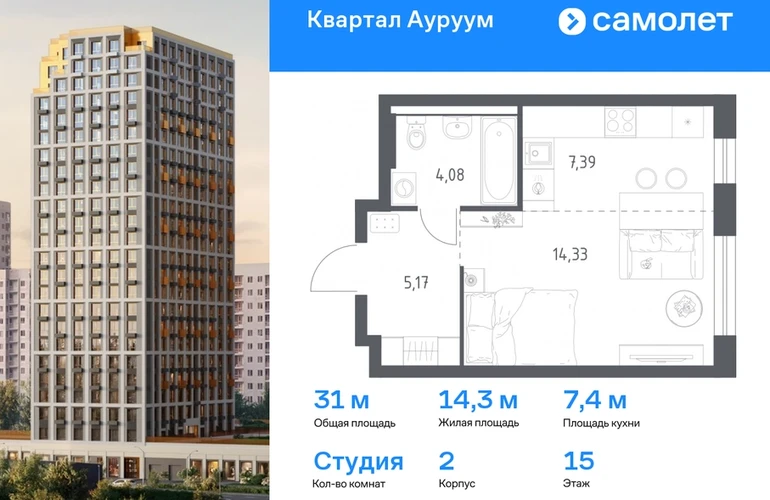 Предлагается квартира студия бизнес-класса 30,97 кв.м в корпусе 2 на 15 этаже, в ЖК «Квартал Ауруум» Квартира с предчистовой отделкой. Доступность дополнительных опций уточняйте у застройщика. Приобрести квартиру возможно по специальным акциям от застройщика, с текущими условиями акций можно ознакомиться в блоке “Акций”. Цена динамическая и может отличаться, уточняйте актуальность у застройщика. «Квартал Ауруум» — это море зелени под вашими окнами и жизнь в уютном квартале с собственной инфраструктурой. До центра города — всего 15 минут на авто. Жилой квартал находится в развитом районе, где все необходимое рядом — свой детский сад, магазины, кафе и школа — через дорогу. 4 разновысотных корпуса, от 14 до 31 этажа, дарят ощущение простора и много естественного света в квартирах. Для неспешных прогулок - приватный двор-сад или Основинский парк у подножия комплекса. Для авто — подземный паркинг. Все квартиры с предчистовой отделкой.#yan19-2r1754947#О застройщике
