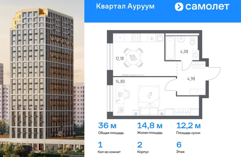 Предлагается 1-комнатная квартира бизнес-класса 35,6 кв.м в корпусе 2 на 6 этаже, в ЖК «Квартал Ауруум» Квартира с предчистовой отделкой. Доступность дополнительных опций уточняйте у застройщика. Приобрести квартиру возможно по специальным акциям от застройщика, с текущими условиями акций можно ознакомиться в блоке “Акций”. Цена динамическая и может отличаться, уточняйте актуальность у застройщика. «Квартал Ауруум» — это море зелени под вашими окнами и жизнь в уютном квартале с собственной инфраструктурой. До центра города — всего 15 минут на авто. Жилой квартал находится в развитом районе, где все необходимое рядом — свой детский сад, магазины, кафе и школа — через дорогу. 4 разновысотных корпуса, от 14 до 31 этажа, дарят ощущение простора и много естественного света в квартирах. Для неспешных прогулок - приватный двор-сад или Основинский парк у подножия комплекса. Для авто — подземный паркинг. Все квартиры с предчистовой отделкой.#yan19-2r1765288#О застройщике