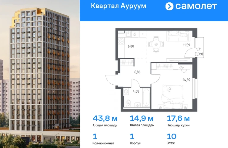 Предлагается 1-комнатная квартира бизнес-класса 43,84 кв.м в корпусе 1 на 10 этаже, в ЖК «Квартал Ауруум» Квартира без отделки. Доступность опции "отделка" и возможность комплектации мебелью и декором уточняйте у застройщика. Приобрести квартиру возможно по специальным акциям от застройщика, с текущими условиями акций можно ознакомиться в блоке “Акций”. Цена динамическая и может отличаться, уточняйте актуальность у застройщика. «Квартал Ауруум» — это море зелени под вашими окнами и жизнь в уютном квартале с собственной инфраструктурой. До центра города — всего 15 минут на авто. Жилой квартал находится в развитом районе, где все необходимое рядом — свой детский сад, магазины, кафе и школа — через дорогу. 4 разновысотных корпуса, от 14 до 31 этажа, дарят ощущение простора и много естественного света в квартирах. Для неспешных прогулок - приватный двор-сад или Основинский парк у подножия комплекса. Для авто — подземный паркинг. Все квартиры с предчистовой отделкой.#yan19-2r1787328#О застройщике