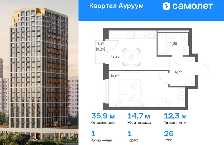 Предлагается 1-комнатная квартира бизнес-класса 35,94 кв.м в корпусе 1 на 26 этаже, в ЖК «Квартал Ауруум» Квартира без отделки. Доступность опции "отделка" и возможность комплектации мебелью и декором уточняйте у застройщика. Приобрести квартиру возможно по специальным акциям от застройщика, с текущими условиями акций можно ознакомиться в блоке “Акций”. Цена динамическая и может отличаться, уточняйте актуальность у застройщика. «Квартал Ауруум» — это море зелени под вашими окнами и жизнь в уютном квартале с собственной инфраструктурой. До центра города — всего 15 минут на авто. Жилой квартал находится в развитом районе, где все необходимое рядом — свой детский сад, магазины, кафе и школа — через дорогу. 4 разновысотных корпуса, от 14 до 31 этажа, дарят ощущение простора и много естественного света в квартирах. Для неспешных прогулок - приватный двор-сад или Основинский парк у подножия комплекса. Для авто — подземный паркинг. Все квартиры с предчистовой отделкой.#yan19-2r1787332#О застройщике
