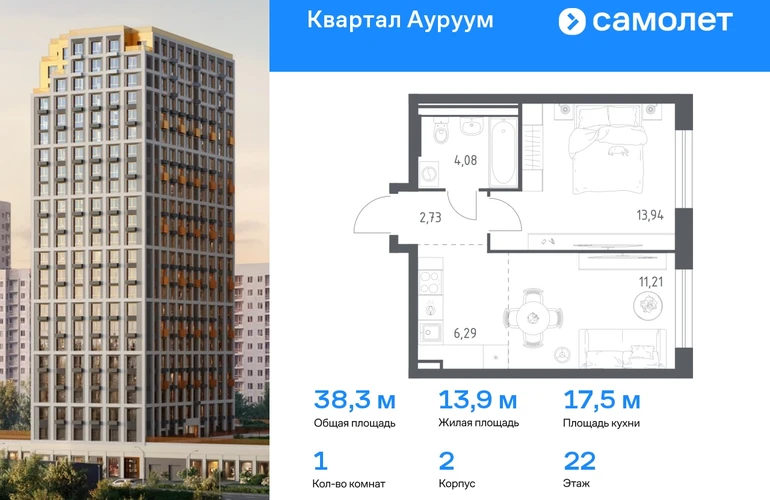 Предлагается 1-комнатная квартира бизнес-класса 38,1 кв.м в корпусе 2 на 22 этаже, в ЖК «Квартал Ауруум» Квартира с предчистовой отделкой. Доступность дополнительных опций уточняйте у застройщика. Приобрести квартиру возможно по специальным акциям от застройщика, с текущими условиями акций можно ознакомиться в блоке “Акций”. Цена динамическая и может отличаться, уточняйте актуальность у застройщика. «Квартал Ауруум» — это море зелени под вашими окнами и жизнь в уютном квартале с собственной инфраструктурой. До центра города — всего 15 минут на авто. Жилой квартал находится в развитом районе, где все необходимое рядом — свой детский сад, магазины, кафе и школа — через дорогу. 4 разновысотных корпуса, от 14 до 31 этажа, дарят ощущение простора и много естественного света в квартирах. Для неспешных прогулок - приватный двор-сад или Основинский парк у подножия комплекса. Для авто — подземный паркинг. Все квартиры с предчистовой отделкой.#yan19-2r1790607#О застройщике