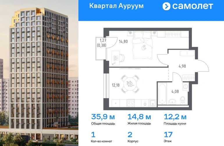 Предлагается 1-комнатная квартира бизнес-класса 35,9 кв.м в корпусе 2 на 17 этаже, в ЖК «Квартал Ауруум» Квартира с предчистовой отделкой. Доступность дополнительных опций уточняйте у застройщика. Приобрести квартиру возможно по специальным акциям от застройщика, с текущими условиями акций можно ознакомиться в блоке «Акций». Цена динамическая и может отличаться, уточняйте актуальность у застройщика. «Квартал Ауруум» — это море зелени под вашими окнами и жизнь в уютном квартале с собственной инфраструктурой. До центра города — всего 15 минут на авто. Жилой квартал находится в развитом районе, где все необходимое рядом — свой детский сад, магазины, кафе и школа — через дорогу. 4 разновысотных корпуса, от 14 до 31 этажа, дарят ощущение простора и много естественного света в квартирах. Для неспешных прогулок - приватный двор-сад или Основинский парк у подножия комплекса. Для авто — подземный паркинг. Все квартиры с предчистовой отделкой.#yan19-2r1797804#О застройщике