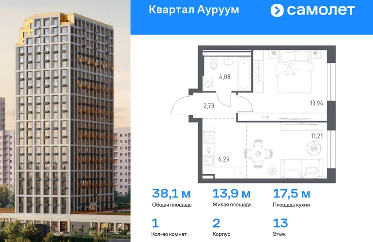 Предлагается 1-комнатная квартира бизнес-класса 38,1 кв.м в корпусе 2 на 13 этаже, в ЖК «Квартал Ауруум» Квартира с предчистовой отделкой. Доступность дополнительных опций уточняйте у застройщика. Приобрести квартиру возможно по специальным акциям от застройщика, с текущими условиями акций можно ознакомиться в блоке «Акций». Цена динамическая и может отличаться, уточняйте актуальность у застройщика. «Квартал Ауруум» — это море зелени под вашими окнами и жизнь в уютном квартале с собственной инфраструктурой. До центра города — всего 15 минут на авто. Жилой квартал находится в развитом районе, где все необходимое рядом — свой детский сад, магазины, кафе и школа — через дорогу. 4 разновысотных корпуса, от 14 до 31 этажа, дарят ощущение простора и много естественного света в квартирах. Для неспешных прогулок - приватный двор-сад или Основинский парк у подножия комплекса. Для авто — подземный паркинг. Все квартиры с предчистовой отделкой.#yan19-2r1798839#О застройщике