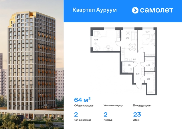 Строим кварталы для жизни с заботой о будущем. Предлагается 2-комнатная квартира бизнес-класса 64 кв.м в корпусе 2 на 23 этаже, в ЖК «Квартал Ауруум» Квартира с предчистовой отделкой. Доступность дополнительных опций уточняйте у застройщика. Приобрести квартиру возможно по специальным акциям от застройщика, с текущими условиями акций можно ознакомиться в блоке «Акций». Цена динамическая и может отличаться, уточняйте актуальность у застройщика. «Квартал Ауруум» — это море зелени под вашими окнами и жизнь в уютном квартале с собственной инфраструктурой. До центра города — всего 15 минут на авто. Жилой квартал находится в развитом районе, где все необходимое рядом — свой детский сад, магазины, кафе и школа — через дорогу. 4 разновысотных корпуса, от 14 до 31 этажа, дарят ощущение простора и много естественного света в квартирах. Для неспешных прогулок - приватный двор-сад или Основинский парк у подножия комплекса. Для авто — подземный паркинг. Все квартиры с предчистовой отделкой.#yan19-2r1815840#О застройщике