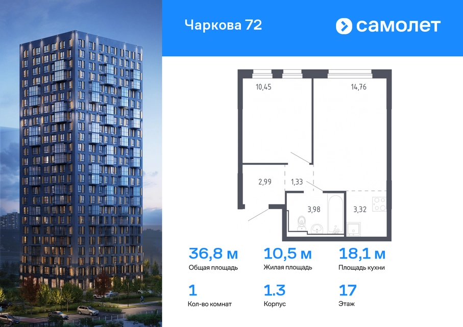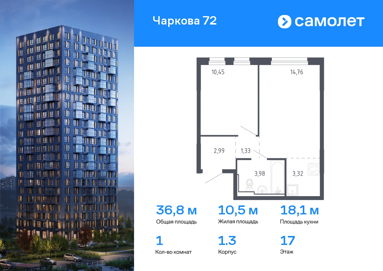 Строим кварталы для жизни с заботой о будущем. Предлагается 1-комнатная квартира комфорт-класса 36,83 кв.м в корпусе 1.3 на 17 этаже, в ЖК «Чаркова 72» Квартира с предчистовой отделкой. Доступность дополнительных опций уточняйте у застройщика. Приобрести квартиру возможно по специальным акциям от застройщика, с текущими условиями акций можно ознакомиться в блоке «Акций». Цена динамическая и может отличаться, уточняйте актуальность у застройщика. Идеальное сочетание городского комфорта и размеренной жизни — квартал «Чаркова 72» на северо-востоке города. В дизайне 17-24-этажных домов с панорамными балконами нашли отражение нотки сибирской природы. От «Чаркова 72» удобно добираться до центра города — всего 17 минут пути. А в 2 минутах от дома находится Тобольский тракт. Для семейного отдыха отлично подойдет парк Гагарина — он находится в 7 минутах от квартала. В закрытых дворах тихо и уютно — все авто остались на одном из 4 многоуровневых паркингов, которые находятся за территорией квартала. Можно спокойно гулять по бульвару и заниматься йогой на спортивной площадке. На первых этажах домов — кафе и магазины. Рядом с проектом — детские сады и школы, городская поликлиника и МФЦ. Во всех квартирах есть выводы под кондиционеры, на подземных этажах — индивидуальные кладовые, на первых — места для хранения велосипедов и колясок. В квартирах можно выбрать варианты отделки: чистовая, черновая и улучшенная из материалов повышенного класса.#yan19-2r1403147#О застройщике