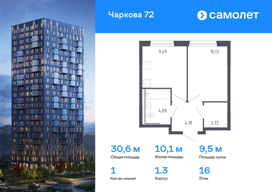 Строим кварталы для жизни с заботой о будущем. Предлагается 1-комнатная квартира комфорт-класса 30,6 кв.м в корпусе 1.3 на 16 этаже, в ЖК «Чаркова 72» Квартира с предчистовой отделкой. Доступность дополнительных опций уточняйте у застройщика. Приобрести квартиру возможно по специальным акциям от застройщика, с текущими условиями акций можно ознакомиться в блоке «Акций». Цена динамическая и может отличаться, уточняйте актуальность у застройщика. Идеальное сочетание городского комфорта и размеренной жизни — квартал «Чаркова 72» на северо-востоке города. В дизайне 17-24-этажных домов с панорамными балконами нашли отражение нотки сибирской природы. От «Чаркова 72» удобно добираться до центра города — всего 17 минут пути. А в 2 минутах от дома находится Тобольский тракт. Для семейного отдыха отлично подойдет парк Гагарина — он находится в 7 минутах от квартала. В закрытых дворах тихо и уютно — все авто остались на одном из 4 многоуровневых паркингов, которые находятся за территорией квартала. Можно спокойно гулять по бульвару и заниматься йогой на спортивной площадке. На первых этажах домов — кафе и магазины. Рядом с проектом — детские сады и школы, городская поликлиника и МФЦ. Во всех квартирах есть выводы под кондиционеры, на подземных этажах — индивидуальные кладовые, на первых — места для хранения велосипедов и колясок. В квартирах можно выбрать варианты отделки: чистовая, черновая и улучшенная из материалов повышенного класса.#yan19-2r1495463#О застройщике
