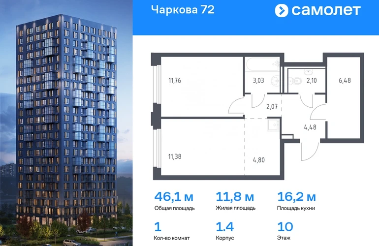 Строим кварталы для жизни с заботой о будущем. Предлагается 1-комнатная квартира комфорт-класса 46,1 кв.м в корпусе 1.4 на 10 этаже, в ЖК «Чаркова 72» Квартира с чистовой отделкой. Доступность дополнительных опций уточняйте у застройщика. Приобрести квартиру возможно по специальным акциям от застройщика, с текущими условиями акций можно ознакомиться в блоке «Акций». Цена динамическая и может отличаться, уточняйте актуальность у застройщика. Идеальное сочетание городского комфорта и размеренной жизни — квартал «Чаркова 72» на северо-востоке города. В дизайне 17-24-этажных домов с панорамными балконами нашли отражение нотки сибирской природы. От «Чаркова 72» удобно добираться до центра города — всего 17 минут пути. А в 2 минутах от дома находится Тобольский тракт. Для семейного отдыха отлично подойдет парк Гагарина — он находится в 7 минутах от квартала. В закрытых дворах тихо и уютно — все авто остались на одном из 4 многоуровневых паркингов, которые находятся за территорией квартала. Можно спокойно гулять по бульвару и заниматься йогой на спортивной площадке. На первых этажах домов — кафе и магазины. Рядом с проектом — детские сады и школы, городская поликлиника и МФЦ. Во всех квартирах есть выводы под кондиционеры, на подземных этажах — индивидуальные кладовые, на первых — места для хранения велосипедов и колясок. В квартирах можно выбрать варианты отделки: чистовая, черновая и улучшенная из материалов повышенного класса.#yan19-2r1506829#О застройщике