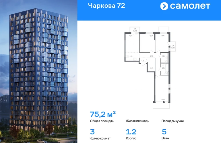 Предлагается 3-комнатная квартира комфорт-класса 75,2 кв.м в корпусе 1.2 на 5 этаже, в ЖК «Чаркова 72» Квартира с чистовой отделкой. Доступность дополнительных опций уточняйте у застройщика. Приобрести квартиру возможно по специальным акциям от застройщика, с текущими условиями акций можно ознакомиться в блоке «Акций». Цена динамическая и может отличаться, уточняйте актуальность у застройщика. Идеальное сочетание городского комфорта и размеренной жизни — квартал «Чаркова 72» на северо-востоке города. В дизайне 17-24-этажных домов с панорамными балконами нашли отражение нотки сибирской природы. От «Чаркова 72» удобно добираться до центра города — всего 17 минут пути. А в 2 минутах от дома находится Тобольский тракт. Для семейного отдыха отлично подойдет парк Гагарина — он находится в 7 минутах от квартала. В закрытых дворах тихо и уютно — все авто остались на одном из 4 многоуровневых паркингов, которые находятся за территорией квартала. Можно спокойно гулять по бульвару и заниматься йогой на спортивной площадке. На первых этажах домов — кафе и магазины. Рядом с проектом — детские сады и школы, городская поликлиника и МФЦ. Во всех квартирах есть выводы под кондиционеры, на подземных этажах — индивидуальные кладовые, на первых — места для хранения велосипедов и колясок. В квартирах можно выбрать варианты отделки: чистовая, черновая и улучшенная из материалов повышенного класса.#yan19-2r1557940#О застройщике