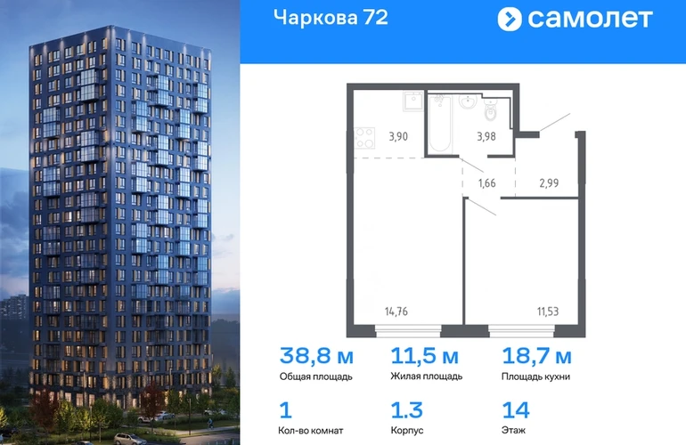 Строим кварталы для жизни с заботой о будущем. Предлагается 1-комнатная квартира комфорт-класса 38,82 кв.м в корпусе 1.3 на 14 этаже, в ЖК «Чаркова 72» Квартира с предчистовой отделкой. Доступность дополнительных опций уточняйте у застройщика. Приобрести квартиру возможно по специальным акциям от застройщика, с текущими условиями акций можно ознакомиться в блоке «Акций». Цена динамическая и может отличаться, уточняйте актуальность у застройщика. Идеальное сочетание городского комфорта и размеренной жизни — квартал «Чаркова 72» на северо-востоке города. В дизайне 17-24-этажных домов с панорамными балконами нашли отражение нотки сибирской природы. От «Чаркова 72» удобно добираться до центра города — всего 17 минут пути. А в 2 минутах от дома находится Тобольский тракт. Для семейного отдыха отлично подойдет парк Гагарина — он находится в 7 минутах от квартала. В закрытых дворах тихо и уютно — все авто остались на одном из 4 многоуровневых паркингов, которые находятся за территорией квартала. Можно спокойно гулять по бульвару и заниматься йогой на спортивной площадке. На первых этажах домов — кафе и магазины. Рядом с проектом — детские сады и школы, городская поликлиника и МФЦ. Во всех квартирах есть выводы под кондиционеры, на подземных этажах — индивидуальные кладовые, на первых — места для хранения велосипедов и колясок. В квартирах можно выбрать варианты отделки: чистовая, черновая и улучшенная из материалов повышенного класса.#yan19-2r1560626#О застройщике