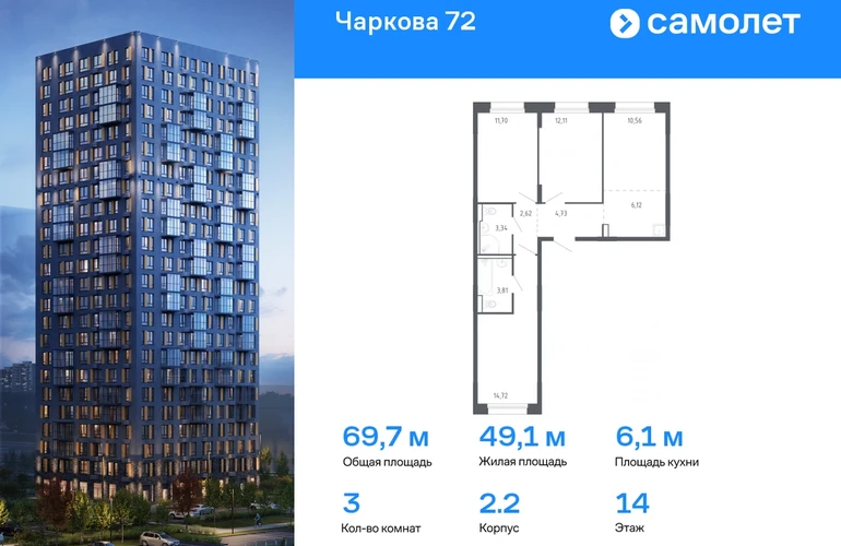 Строим кварталы для жизни с заботой о будущем. Предлагается 3-комнатная квартира комфорт-класса 69,71 кв.м в корпусе 2.2 на 14 этаже, в ЖК «Чаркова 72» Квартира с предчистовой отделкой. Доступность дополнительных опций уточняйте у застройщика. Приобрести квартиру возможно по специальным акциям от застройщика, с текущими условиями акций можно ознакомиться в блоке «Акций». Цена динамическая и может отличаться, уточняйте актуальность у застройщика. Идеальное сочетание городского комфорта и размеренной жизни — квартал «Чаркова 72» на северо-востоке города. В дизайне 17-24-этажных домов с панорамными балконами нашли отражение нотки сибирской природы. От «Чаркова 72» удобно добираться до центра города — всего 17 минут пути. А в 2 минутах от дома находится Тобольский тракт. Для семейного отдыха отлично подойдет парк Гагарина — он находится в 7 минутах от квартала. В закрытых дворах тихо и уютно — все авто остались на одном из 4 многоуровневых паркингов, которые находятся за территорией квартала. Можно спокойно гулять по бульвару и заниматься йогой на спортивной площадке. На первых этажах домов — кафе и магазины. Рядом с проектом — детские сады и школы, городская поликлиника и МФЦ. Во всех квартирах есть выводы под кондиционеры, на подземных этажах — индивидуальные кладовые, на первых — места для хранения велосипедов и колясок. В квартирах можно выбрать варианты отделки: чистовая, черновая и улучшенная из материалов повышенного класса.#yan19-2r1574163#О застройщике