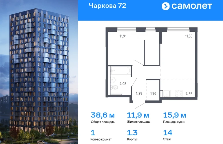 Предлагается 1-комнатная квартира комфорт-класса 38,56 кв.м в корпусе 1.3 на 14 этаже, в ЖК «Чаркова 72» Квартира с чистовой отделкой. Доступность дополнительных опций уточняйте у застройщика. Планировкой предусмотрены: Прихожая - 4,79 м² Кухня-ниша - 4,35 м² Жилая_комната_1 - 11,53 м² Жилая_комната_2 - 11,91 м² СУ_1 - 4,08 м² Гардеробная_1 - 1,9 м² Приобрести квартиру возможно по специальным акциям от застройщика, с текущими условиями акций можно ознакомиться в блоке “Акций”. Цена динамическая и может отличаться, уточняйте актуальность у застройщика. Идеальное сочетание городского комфорта и размеренной жизни — квартал «Чаркова 72» на северо-востоке города. В дизайне 17-24-этажных домов с панорамными балконами нашли отражение нотки сибирской природы. От «Чаркова 72» удобно добираться до центра города — всего 17 минут пути. А в 2 минутах от дома находится Тобольский тракт. Для семейного отдыха отлично подойдет парк Гагарина — он находится в 7 минутах от квартала. В закрытых дворах тихо и уютно — все авто остались на одном из 4 многоуровневых паркингов, которые находятся за территорией квартала. Можно спокойно гулять по бульвару и заниматься йогой на спортивной площадке. На первых этажах домов — кафе и магазины. Рядом с проектом — детские сады и школы, городская поликлиника и МФЦ. Во всех квартирах есть выводы под кондиционеры, на подземных этажах — индивидуальные кладовые, на первых — места для хранения велосипедов и колясок. В квартирах можно выбрать варианты отделки: чистовая, черновая и улучшенная из материалов повышенного класса.#yan19-2r1600068#О застройщике