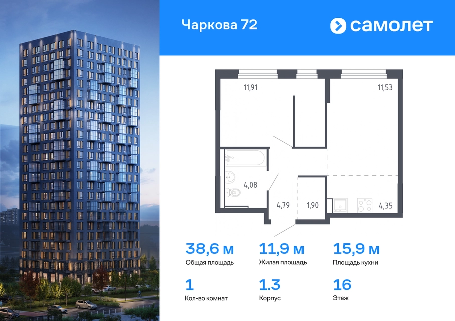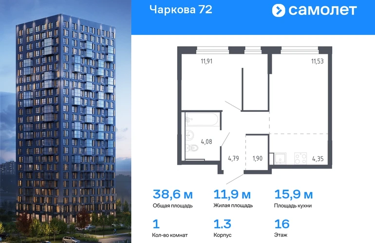 Предлагается 1-комнатная квартира комфорт-класса 38,56 кв.м в корпусе 1.3 на 16 этаже, в ЖК «Чаркова 72» Квартира с чистовой отделкой. Доступность дополнительных опций уточняйте у застройщика. Приобрести квартиру возможно по специальным акциям от застройщика, с текущими условиями акций можно ознакомиться в блоке «Акций». Цена динамическая и может отличаться, уточняйте актуальность у застройщика. Идеальное сочетание городского комфорта и размеренной жизни — квартал «Чаркова 72» на северо-востоке города. В дизайне 17-24-этажных домов с панорамными балконами нашли отражение нотки сибирской природы. От «Чаркова 72» удобно добираться до центра города — всего 17 минут пути. А в 2 минутах от дома находится Тобольский тракт. Для семейного отдыха отлично подойдет парк Гагарина — он находится в 7 минутах от квартала. В закрытых дворах тихо и уютно — все авто остались на одном из 4 многоуровневых паркингов, которые находятся за территорией квартала. Можно спокойно гулять по бульвару и заниматься йогой на спортивной площадке. На первых этажах домов — кафе и магазины. Рядом с проектом — детские сады и школы, городская поликлиника и МФЦ. Во всех квартирах есть выводы под кондиционеры, на подземных этажах — индивидуальные кладовые, на первых — места для хранения велосипедов и колясок. В квартирах можно выбрать варианты отделки: чистовая, черновая и улучшенная из материалов повышенного класса.#yan19-2r1600069#О застройщике