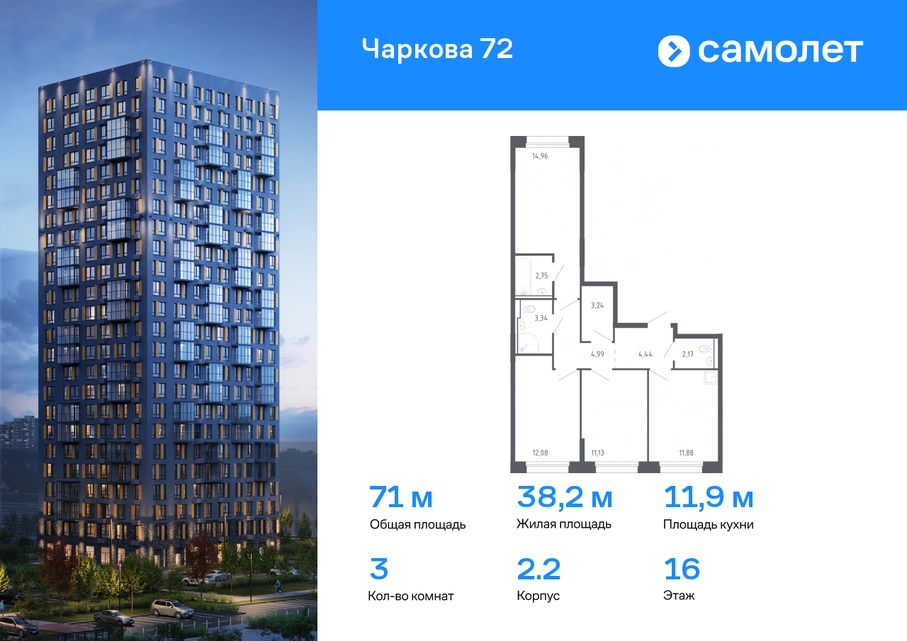 Строим кварталы для жизни с заботой о будущем. Предлагается 3-комнатная квартира комфорт-класса 70,98 кв.м в корпусе 2.2 на 16 этаже, в ЖК «Чаркова 72» Квартира с предчистовой отделкой. Доступность дополнительных опций уточняйте у застройщика. Приобрести квартиру возможно по специальным акциям от застройщика, с текущими условиями акций можно ознакомиться в блоке «Акций». Цена динамическая и может отличаться, уточняйте актуальность у застройщика. Идеальное сочетание городского комфорта и размеренной жизни — квартал «Чаркова 72» на северо-востоке города. В дизайне 17-24-этажных домов с панорамными балконами нашли отражение нотки сибирской природы. От «Чаркова 72» удобно добираться до центра города — всего 17 минут пути. А в 2 минутах от дома находится Тобольский тракт. Для семейного отдыха отлично подойдет парк Гагарина — он находится в 7 минутах от квартала. В закрытых дворах тихо и уютно — все авто остались на одном из 4 многоуровневых паркингов, которые находятся за территорией квартала. Можно спокойно гулять по бульвару и заниматься йогой на спортивной площадке. На первых этажах домов — кафе и магазины. Рядом с проектом — детские сады и школы, городская поликлиника и МФЦ. Во всех квартирах есть выводы под кондиционеры, на подземных этажах — индивидуальные кладовые, на первых — места для хранения велосипедов и колясок. В квартирах можно выбрать варианты отделки: чистовая, черновая и улучшенная из материалов повышенного класса.#yan19-2r1621721#О застройщике