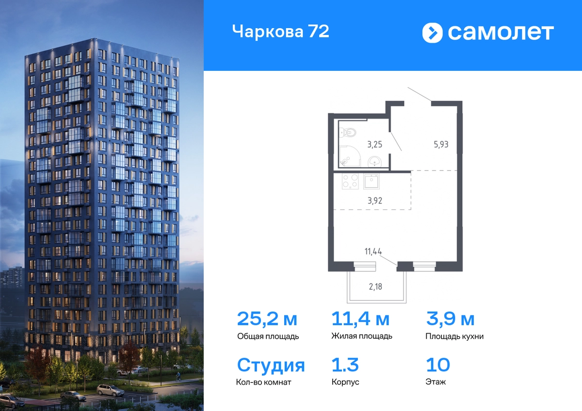 Предлагается квартира студия комфорт-класса 25,19 кв.м в корпусе 1.3 на 10 этаже, в ЖК «Чаркова 72» Квартира с предчистовой отделкой. Доступность дополнительных опций уточняйте у застройщика. Приобрести квартиру возможно по специальным акциям от застройщика, с текущими условиями акций можно ознакомиться в блоке “Акций”. Цена динамическая и может отличаться, уточняйте актуальность у застройщика. Идеальное сочетание городского комфорта и размеренной жизни — квартал «Чаркова 72» на северо-востоке города. В дизайне 17-24-этажных домов с панорамными балконами нашли отражение нотки сибирской природы. От «Чаркова 72» удобно добираться до центра города — всего 17 минут пути. А в 2 минутах от дома находится Тобольский тракт. Для семейного отдыха отлично подойдет парк Гагарина — он находится в 7 минутах от квартала. В закрытых дворах тихо и уютно — все авто остались на одном из 4 многоуровневых паркингов, которые находятся за территорией квартала. Можно спокойно гулять по бульвару и заниматься йогой на спортивной площадке. На первых этажах домов — кафе и магазины. Рядом с проектом — детские сады и школы, городская поликлиника и МФЦ. Во всех квартирах есть выводы под кондиционеры, на подземных этажах — индивидуальные кладовые, на первых — места для хранения велосипедов и колясок. В квартирах можно выбрать варианты отделки: чистовая, черновая и улучшенная из материалов повышенного класса.#yan19-2r1630270#О застройщике
