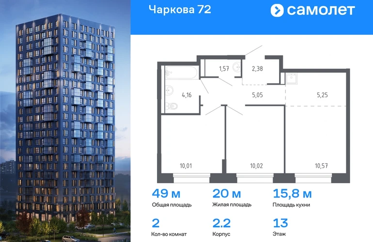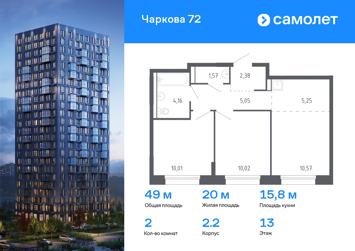 Строим кварталы для жизни с заботой о будущем. Предлагается 2-комнатная квартира комфорт-класса 49,01 кв.м в корпусе 2.2 на 13 этаже, в ЖК «Чаркова 72» Квартира с предчистовой отделкой. Доступность дополнительных опций уточняйте у застройщика. Приобрести квартиру возможно по специальным акциям от застройщика, с текущими условиями акций можно ознакомиться в блоке «Акций». Цена динамическая и может отличаться, уточняйте актуальность у застройщика. Идеальное сочетание городского комфорта и размеренной жизни — квартал «Чаркова 72» на северо-востоке города. В дизайне 17-24-этажных домов с панорамными балконами нашли отражение нотки сибирской природы. От «Чаркова 72» удобно добираться до центра города — всего 17 минут пути. А в 2 минутах от дома находится Тобольский тракт. Для семейного отдыха отлично подойдет парк Гагарина — он находится в 7 минутах от квартала. В закрытых дворах тихо и уютно — все авто остались на одном из 4 многоуровневых паркингов, которые находятся за территорией квартала. Можно спокойно гулять по бульвару и заниматься йогой на спортивной площадке. На первых этажах домов — кафе и магазины. Рядом с проектом — детские сады и школы, городская поликлиника и МФЦ. Во всех квартирах есть выводы под кондиционеры, на подземных этажах — индивидуальные кладовые, на первых — места для хранения велосипедов и колясок. В квартирах можно выбрать варианты отделки: чистовая, черновая и улучшенная из материалов повышенного класса.#yan19-2r1630543#О застройщике