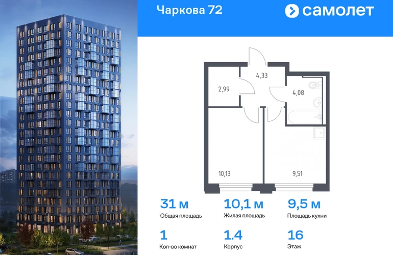 Предлагается 1-комнатная квартира комфорт-класса 31,04 кв.м в корпусе 1.4 на 16 этаже, в ЖК «Чаркова 72» Квартира с чистовой отделкой. Доступность дополнительных опций уточняйте у застройщика. Планировкой предусмотрены: Прихожая - 4,33 м² Кухня - 9,51 м² Жилая_комната_1 - 10,13 м² СУ_1 - 4,08 м² Гардеробная_1 - 2,99 м² Приобрести квартиру возможно по специальным акциям от застройщика, с текущими условиями акций можно ознакомиться в блоке “Акций”. Цена динамическая и может отличаться, уточняйте актуальность у застройщика. Идеальное сочетание городского комфорта и размеренной жизни — квартал «Чаркова 72» на северо-востоке города. В дизайне 17-24-этажных домов с панорамными балконами нашли отражение нотки сибирской природы. От «Чаркова 72» удобно добираться до центра города — всего 17 минут пути. А в 2 минутах от дома находится Тобольский тракт. Для семейного отдыха отлично подойдет парк Гагарина — он находится в 7 минутах от квартала. В закрытых дворах тихо и уютно — все авто остались на одном из 4 многоуровневых паркингов, которые находятся за территорией квартала. Можно спокойно гулять по бульвару и заниматься йогой на спортивной площадке. На первых этажах домов — кафе и магазины. Рядом с проектом — детские сады и школы, городская поликлиника и МФЦ. Во всех квартирах есть выводы под кондиционеры, на подземных этажах — индивидуальные кладовые, на первых — места для хранения велосипедов и колясок. В квартирах можно выбрать варианты отделки: чистовая, черновая и улучшенная из материалов повышенного класса.#yan19-2r1631742#О застройщике