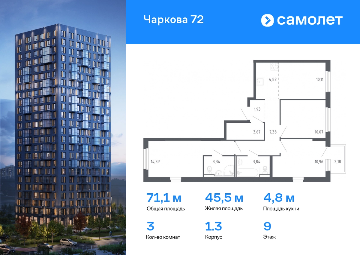 Предлагается 3-комнатная квартира комфорт-класса 71,14 кв.м в корпусе 1.3 на 9 этаже, в ЖК «Чаркова 72» Квартира с предчистовой отделкой. Доступность дополнительных опций уточняйте у застройщика. Приобрести квартиру возможно по специальным акциям от застройщика, с текущими условиями акций можно ознакомиться в блоке “Акций”. Цена динамическая и может отличаться, уточняйте актуальность у застройщика. Идеальное сочетание городского комфорта и размеренной жизни — квартал «Чаркова 72» на северо-востоке города. В дизайне 17-24-этажных домов с панорамными балконами нашли отражение нотки сибирской природы. От «Чаркова 72» удобно добираться до центра города — всего 17 минут пути. А в 2 минутах от дома находится Тобольский тракт. Для семейного отдыха отлично подойдет парк Гагарина — он находится в 7 минутах от квартала. В закрытых дворах тихо и уютно — все авто остались на одном из 4 многоуровневых паркингов, которые находятся за территорией квартала. Можно спокойно гулять по бульвару и заниматься йогой на спортивной площадке. На первых этажах домов — кафе и магазины. Рядом с проектом — детские сады и школы, городская поликлиника и МФЦ. Во всех квартирах есть выводы под кондиционеры, на подземных этажах — индивидуальные кладовые, на первых — места для хранения велосипедов и колясок. В квартирах можно выбрать варианты отделки: чистовая, черновая и улучшенная из материалов повышенного класса.#yan19-2r1631746#О застройщике
