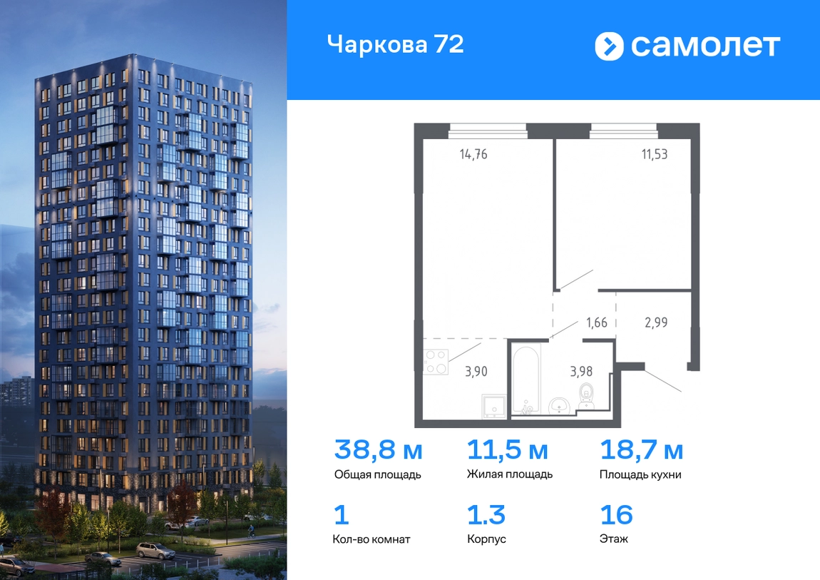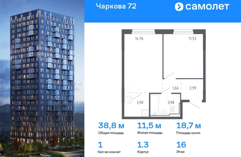 Строим кварталы для жизни с заботой о будущем. Предлагается 1-комнатная квартира комфорт-класса 38,82 кв.м в корпусе 1.3 на 16 этаже, в ЖК «Чаркова 72» Квартира с предчистовой отделкой. Доступность дополнительных опций уточняйте у застройщика. Приобрести квартиру возможно по специальным акциям от застройщика, с текущими условиями акций можно ознакомиться в блоке «Акций». Цена динамическая и может отличаться, уточняйте актуальность у застройщика. Идеальное сочетание городского комфорта и размеренной жизни — квартал «Чаркова 72» на северо-востоке города. В дизайне 17-24-этажных домов с панорамными балконами нашли отражение нотки сибирской природы. От «Чаркова 72» удобно добираться до центра города — всего 17 минут пути. А в 2 минутах от дома находится Тобольский тракт. Для семейного отдыха отлично подойдет парк Гагарина — он находится в 7 минутах от квартала. В закрытых дворах тихо и уютно — все авто остались на одном из 4 многоуровневых паркингов, которые находятся за территорией квартала. Можно спокойно гулять по бульвару и заниматься йогой на спортивной площадке. На первых этажах домов — кафе и магазины. Рядом с проектом — детские сады и школы, городская поликлиника и МФЦ. Во всех квартирах есть выводы под кондиционеры, на подземных этажах — индивидуальные кладовые, на первых — места для хранения велосипедов и колясок. В квартирах можно выбрать варианты отделки: чистовая, черновая и улучшенная из материалов повышенного класса.#yan19-2r1650592#О застройщике