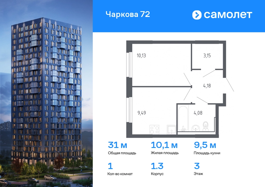 Строим кварталы для жизни с заботой о будущем. Предлагается 1-комнатная квартира комфорт-класса 31,03 кв.м в корпусе 1.3 на 3 этаже, в ЖК «Чаркова 72» Квартира с предчистовой отделкой. Доступность дополнительных опций уточняйте у застройщика. Приобрести квартиру возможно по специальным акциям от застройщика, с текущими условиями акций можно ознакомиться в блоке «Акций». Цена динамическая и может отличаться, уточняйте актуальность у застройщика. Идеальное сочетание городского комфорта и размеренной жизни — квартал «Чаркова 72» на северо-востоке города. В дизайне 17-24-этажных домов с панорамными балконами нашли отражение нотки сибирской природы. От «Чаркова 72» удобно добираться до центра города — всего 17 минут пути. А в 2 минутах от дома находится Тобольский тракт. Для семейного отдыха отлично подойдет парк Гагарина — он находится в 7 минутах от квартала. В закрытых дворах тихо и уютно — все авто остались на одном из 4 многоуровневых паркингов, которые находятся за территорией квартала. Можно спокойно гулять по бульвару и заниматься йогой на спортивной площадке. На первых этажах домов — кафе и магазины. Рядом с проектом — детские сады и школы, городская поликлиника и МФЦ. Во всех квартирах есть выводы под кондиционеры, на подземных этажах — индивидуальные кладовые, на первых — места для хранения велосипедов и колясок. В квартирах можно выбрать варианты отделки: чистовая, черновая и улучшенная из материалов повышенного класса.#yan19-2r1656404#О застройщике
