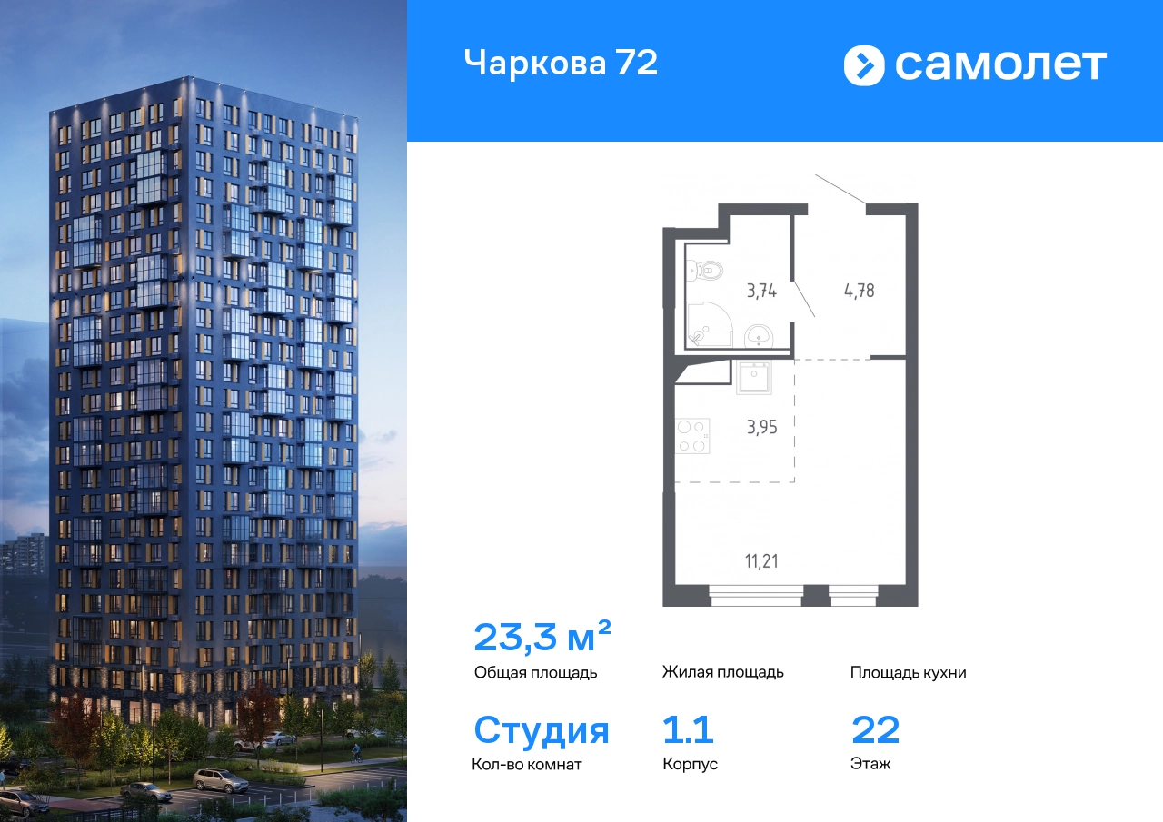 Предлагается квартира студия комфорт-класса 23,3 кв.м в корпусе 1.1 на 22 этаже, в ЖК «Чаркова 72» Квартира без отделки. Доступность опции "отделка" и возможность комплектации мебелью и декором уточняйте у застройщика. Приобрести квартиру возможно по специальным акциям от застройщика, с текущими условиями акций можно ознакомиться в блоке “Акций”. Цена динамическая и может отличаться, уточняйте актуальность у застройщика. Идеальное сочетание городского комфорта и размеренной жизни — квартал «Чаркова 72» на северо-востоке города. В дизайне 17-24-этажных домов с панорамными балконами нашли отражение нотки сибирской природы. От «Чаркова 72» удобно добираться до центра города — всего 17 минут пути. А в 2 минутах от дома находится Тобольский тракт. Для семейного отдыха отлично подойдет парк Гагарина — он находится в 7 минутах от квартала. В закрытых дворах тихо и уютно — все авто остались на одном из 4 многоуровневых паркингов, которые находятся за территорией квартала. Можно спокойно гулять по бульвару и заниматься йогой на спортивной площадке. На первых этажах домов — кафе и магазины. Рядом с проектом — детские сады и школы, городская поликлиника и МФЦ. Во всех квартирах есть выводы под кондиционеры, на подземных этажах — индивидуальные кладовые, на первых — места для хранения велосипедов и колясок. В квартирах можно выбрать варианты отделки: чистовая, черновая и улучшенная из материалов повышенного класса.#yan19-2r1660820#О застройщике
